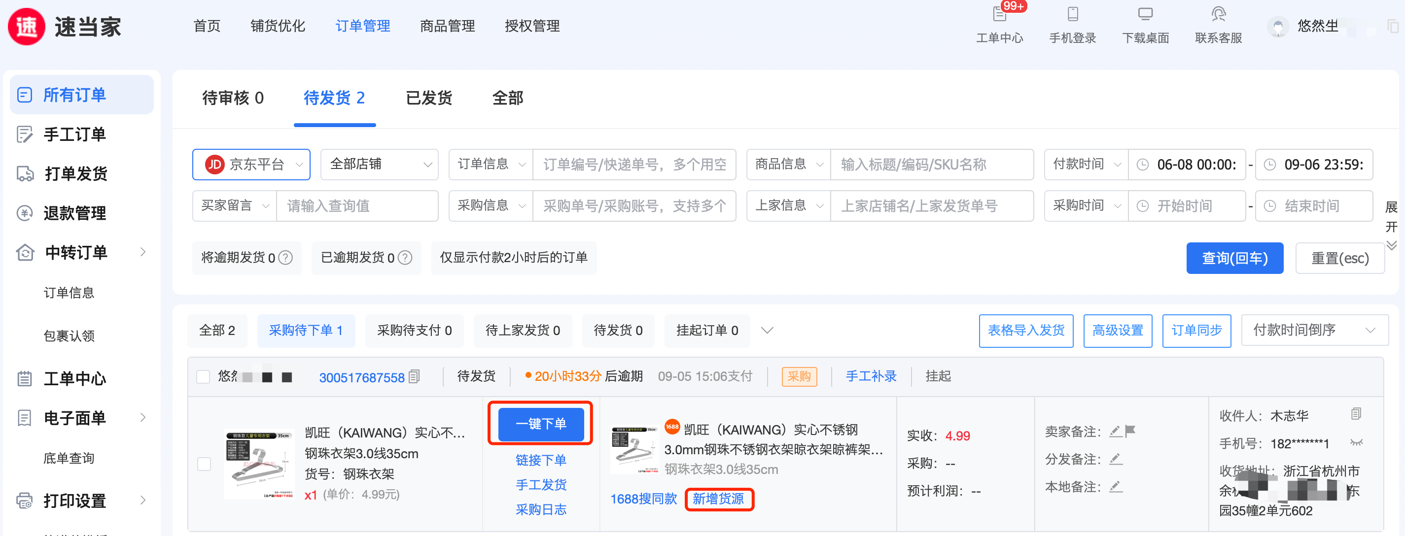 买家下单后,速当家自动关联货源和商品规格,快速向1688采购付款。
