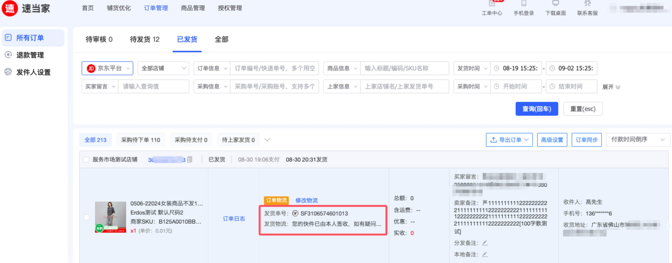 供应商发货后,物流单号自动回传到你的京东店铺,发货状态自动更新为已发货,无需手动发货。