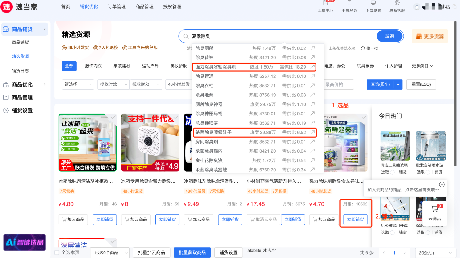 ② 根据全网热搜词一键搜索该词下的精选货源,极速上新发布