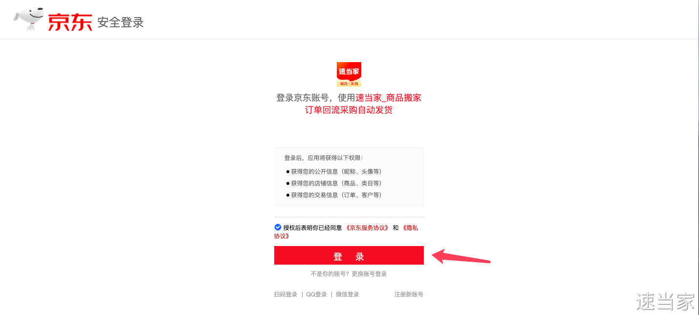 跳转到京东登录页面,登录您的京东店铺,登录成功即授权店铺加入;