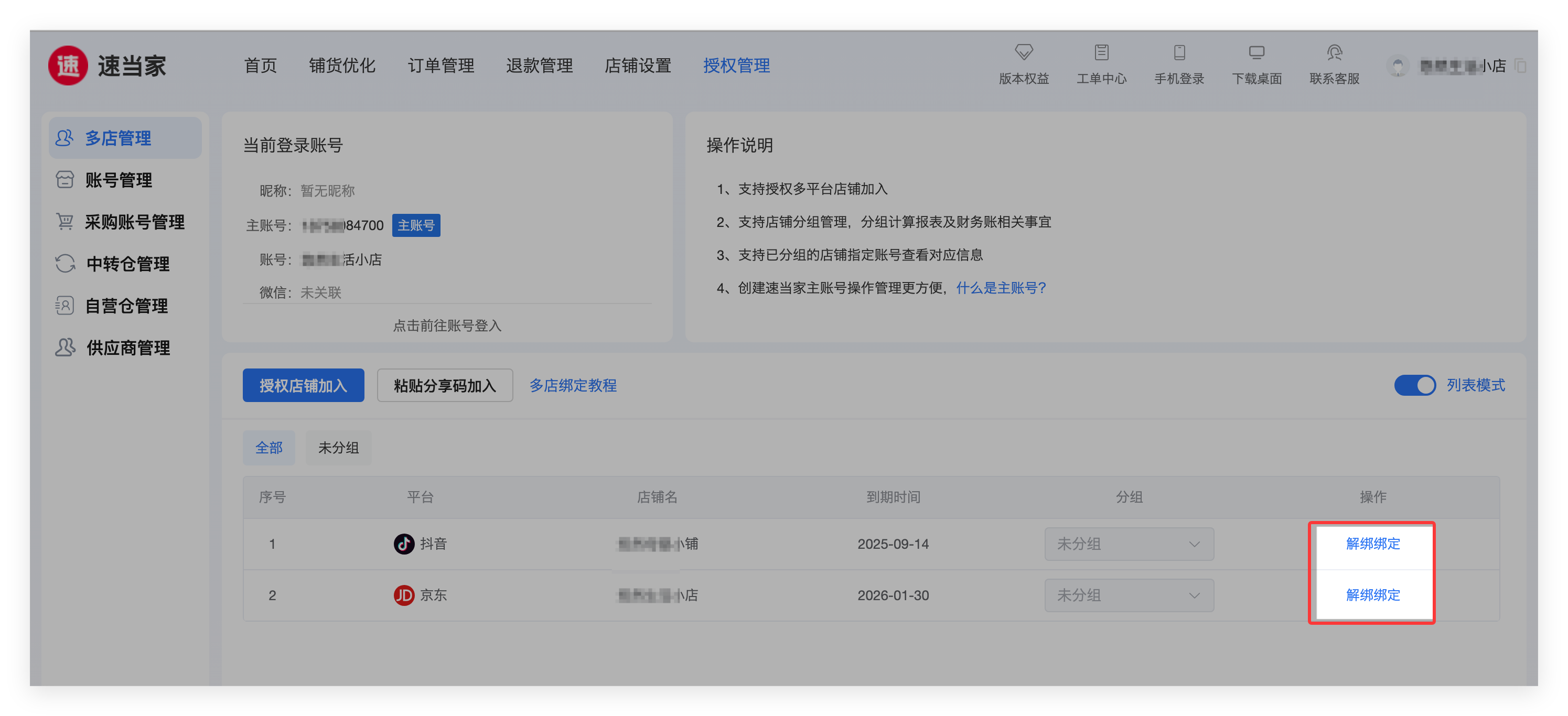 当绑定的店铺闭店、不再合作 或 已到期等原因,可从绑定列表中解绑,解放绑定店铺列表,方便管理;