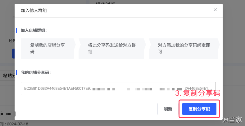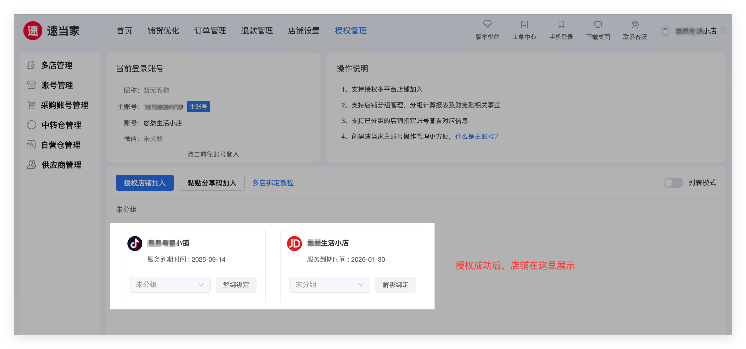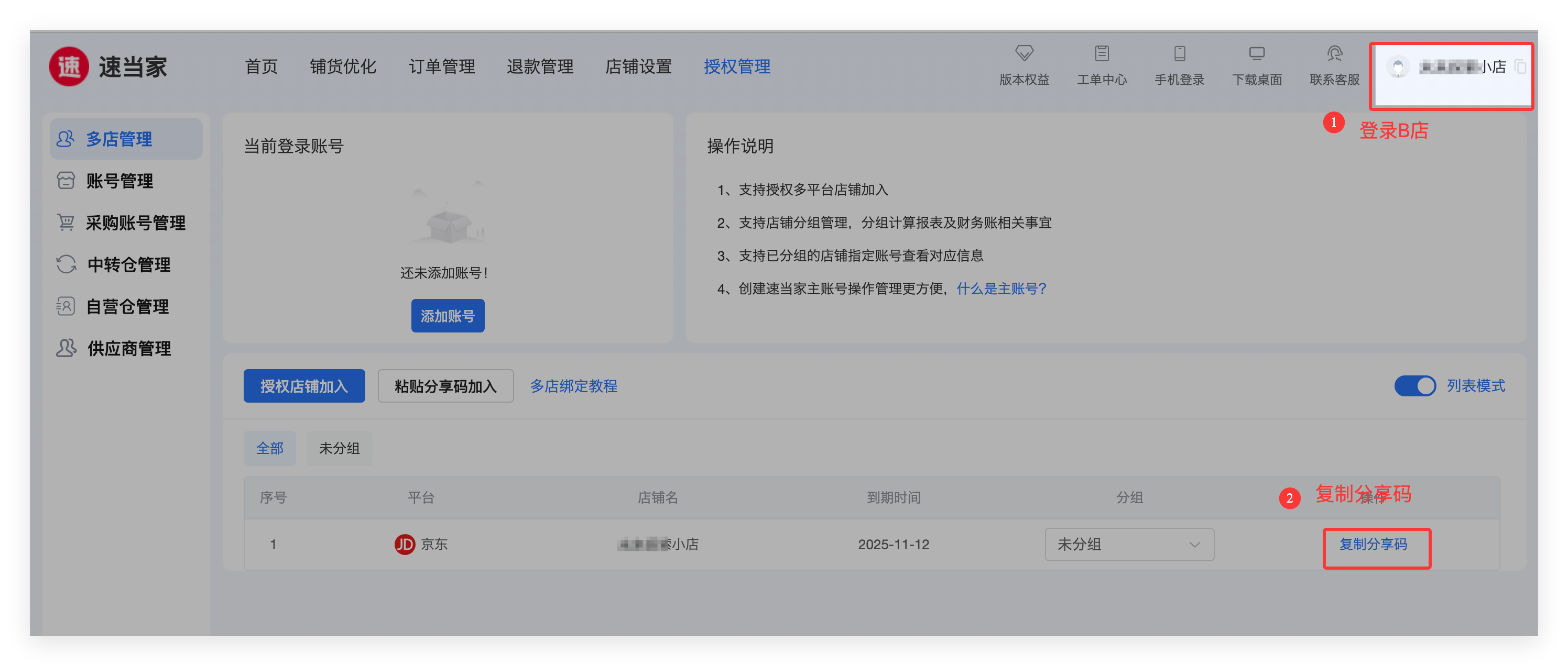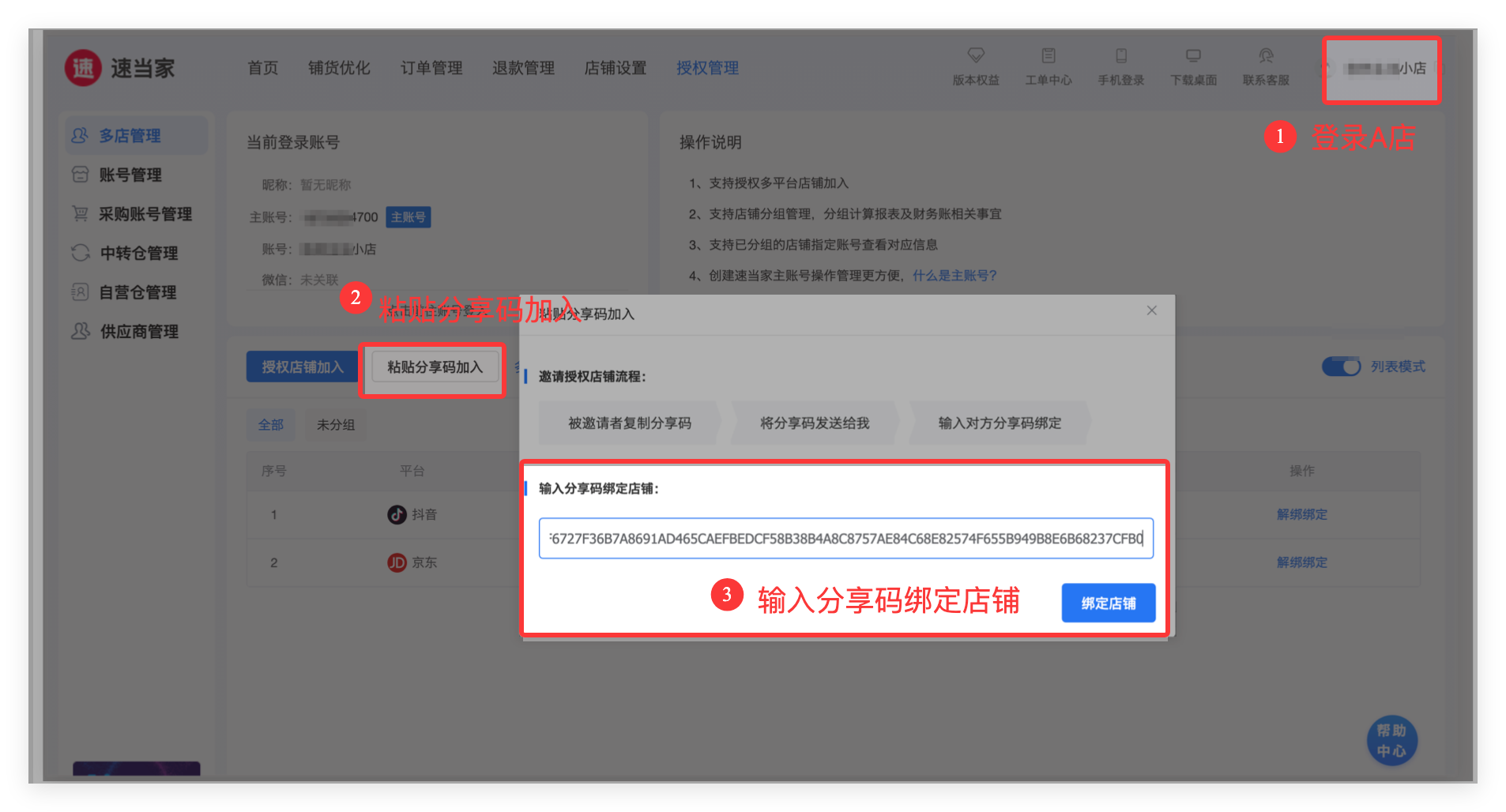 说明:速当家店铺绑定有 2 种方式,① 授权店铺加入;② 店铺分享码加入;