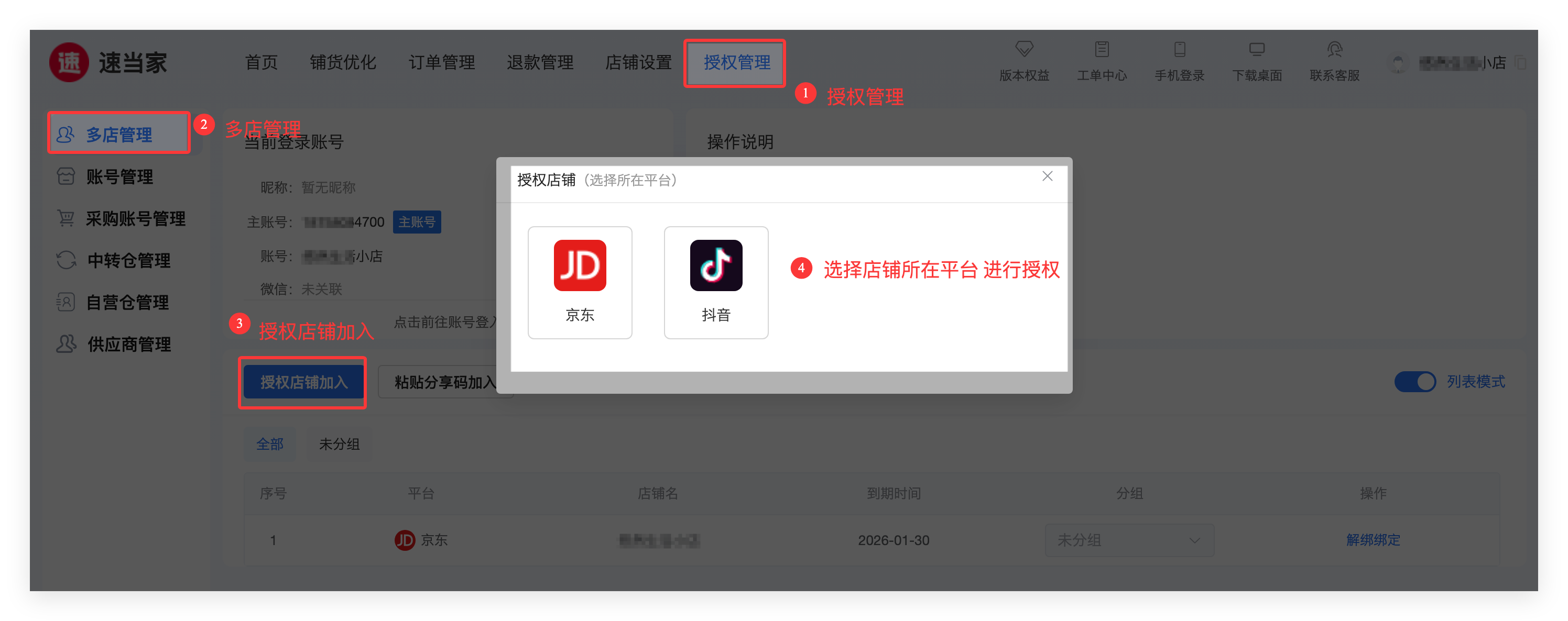 操作路径:授权管理--店铺授权--授权店铺加入--点击平台进行授权;