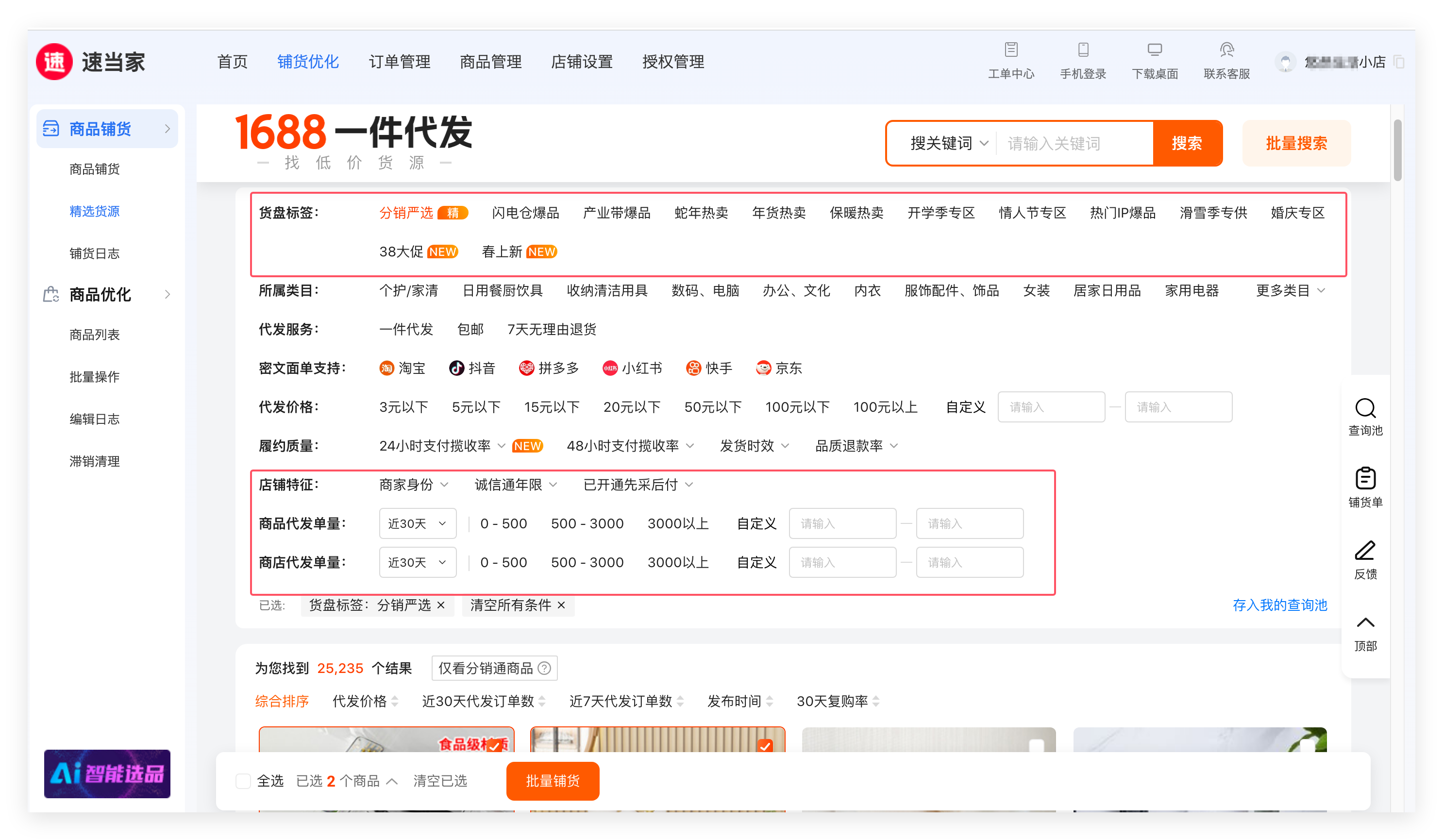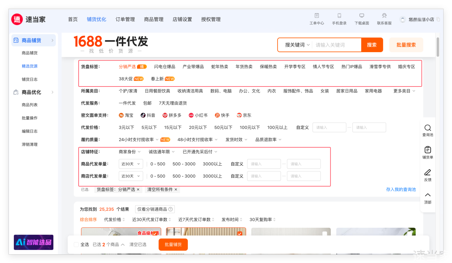 1688低价货源:速当家精选货源内置【1688官方低价货源】,整合上游供应链资源,官方下场亲自把控,提供稳定高效的货源支持。其中包括产业带爆款、ERP代发爆款、官方托管货盘,商家可从中以更优惠的价格挑选更高品质的货源,一键铺货发品。