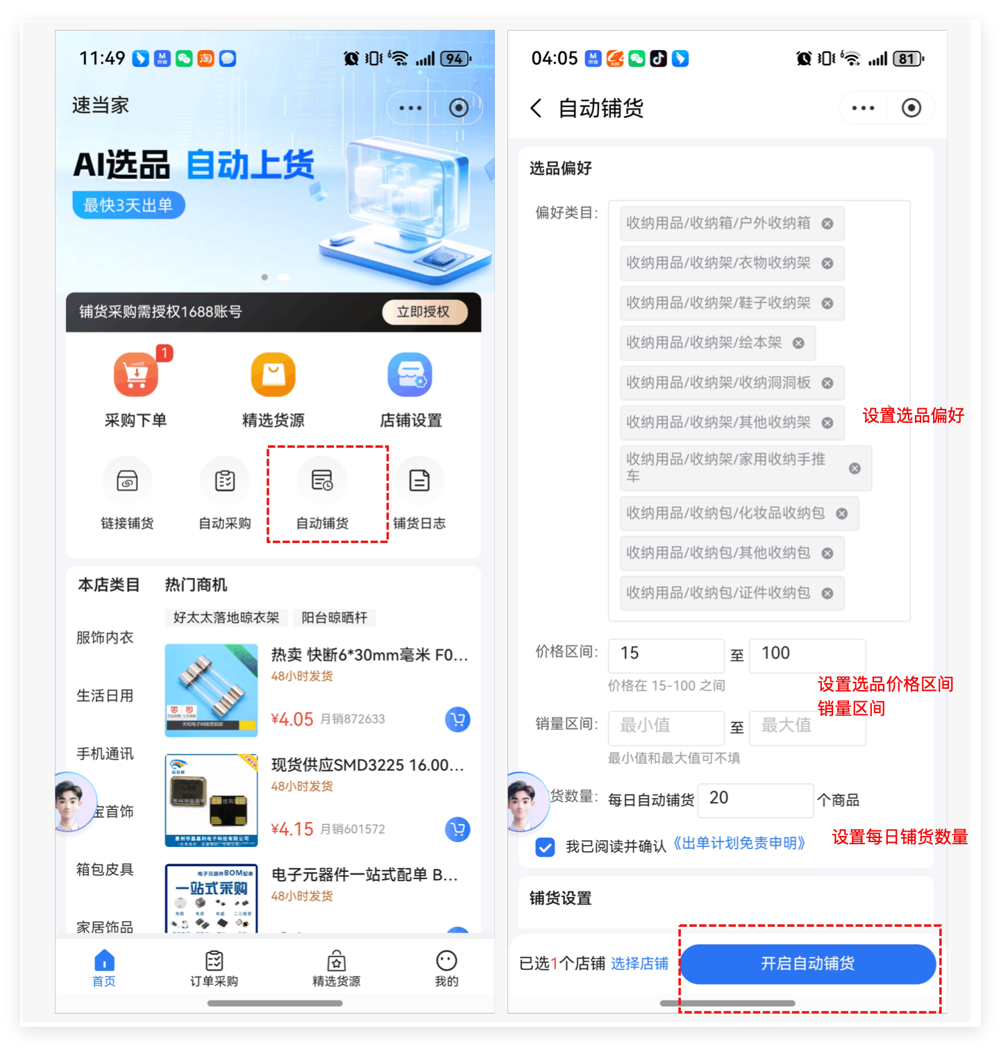 在速当家出单计划,你可以自定义想要经营的类目和每日上货的数量,系统根据您设置类目偏好和选品偏好,使用大数据算法选出京东平台的蓝海产品,按照用户自定义的铺货数量自动铺货。铺货时自动修改售卖价格、设置运费模版、限售区域,删除详情页外链、规避违禁词信息,帮你店铺抢占更多流量,实现高效运营!