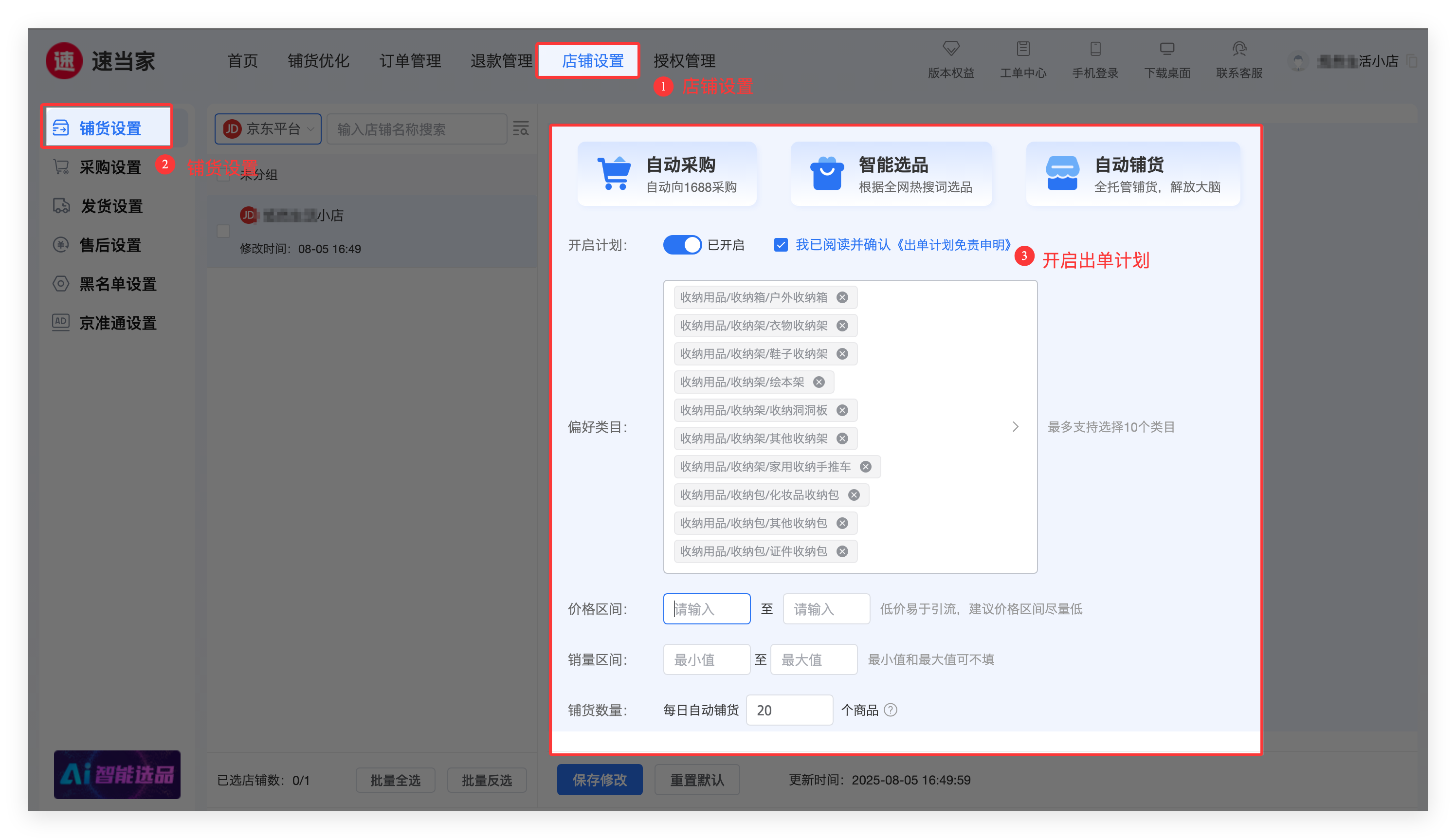 - 第二步:在速当家店铺设置->铺货设置,点击开启【出单计划】