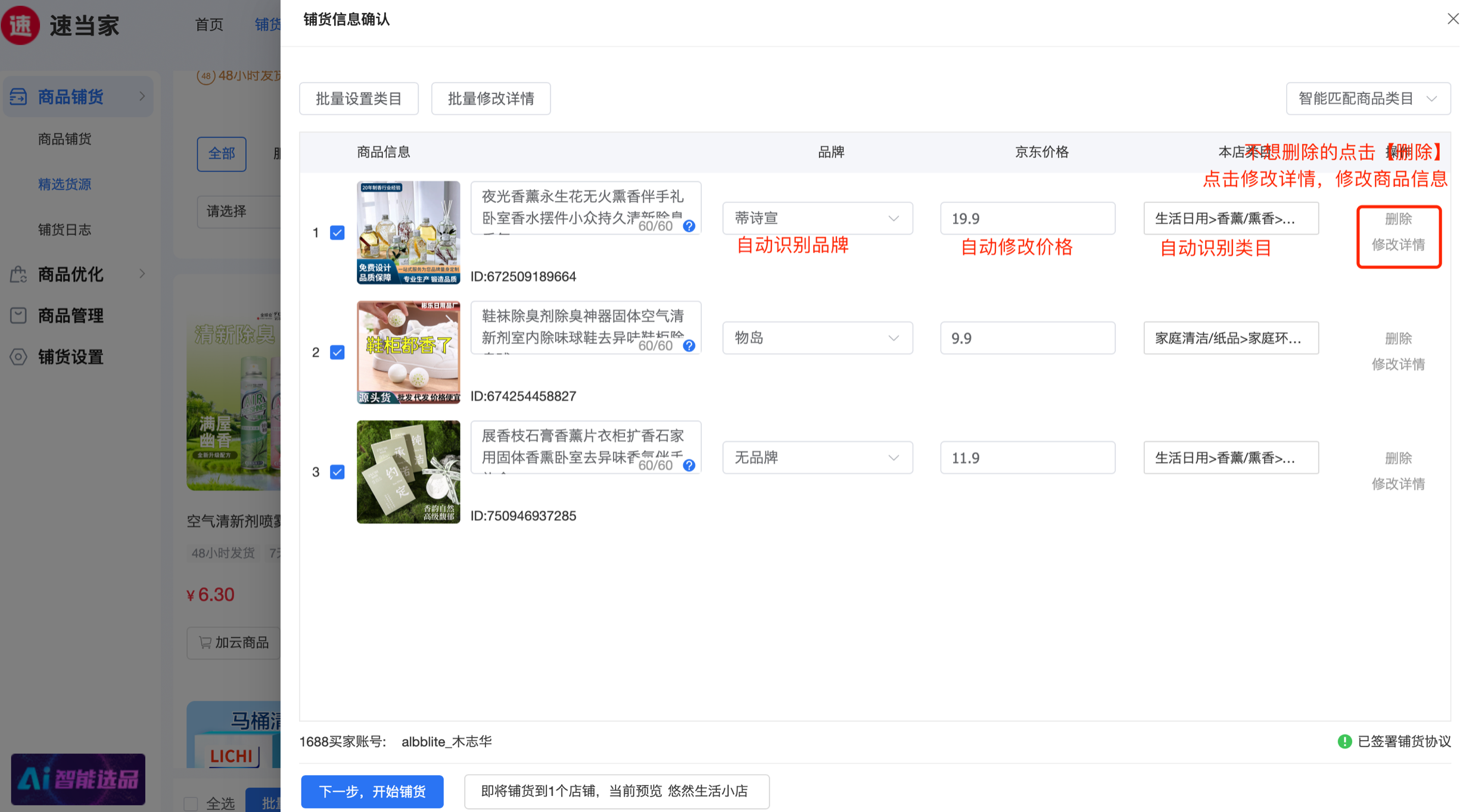 • •铺货过程中,自动修改价格,自动识别品牌和类目,点击【开始铺货】