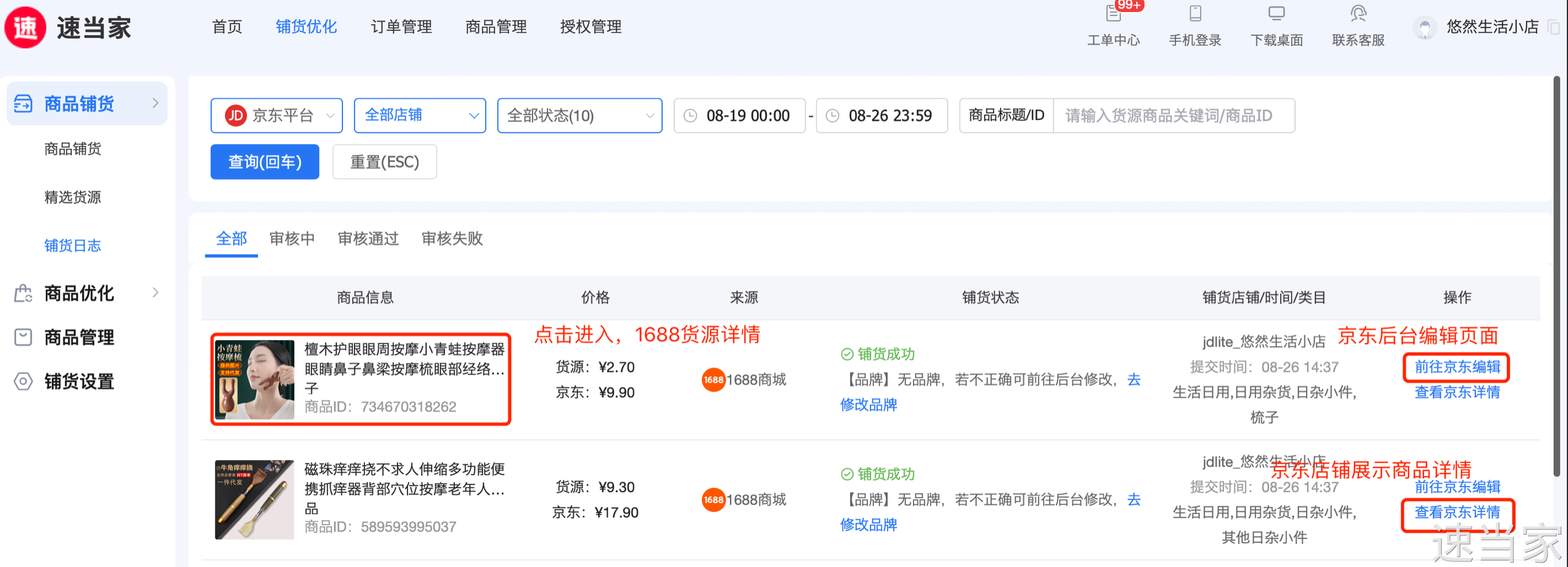 在【铺货日志】中查看铺货结果,包括铺货失败和铺货成功