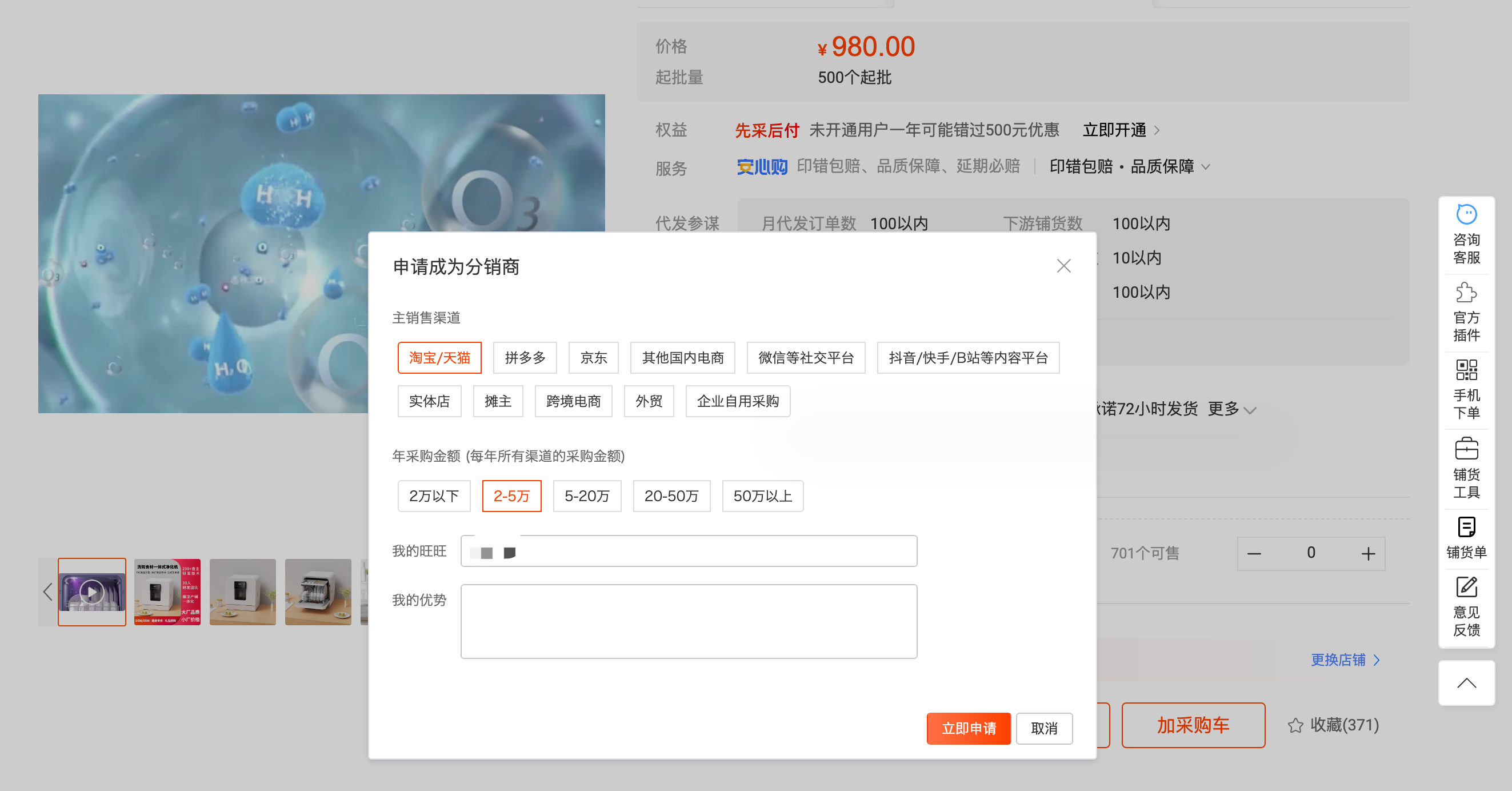 - 若出现弹框,请点击立即申请,申请通过后再进行铺货。
