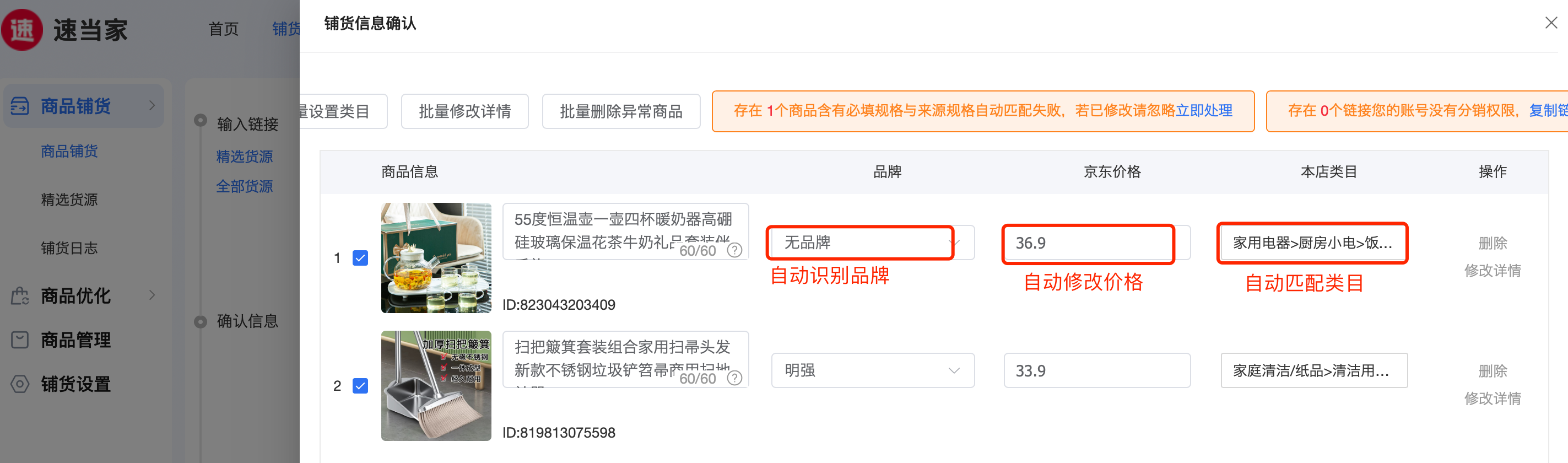 铺货过程中,自动修改价格,自动识别品牌和类目,点击【开始铺货】