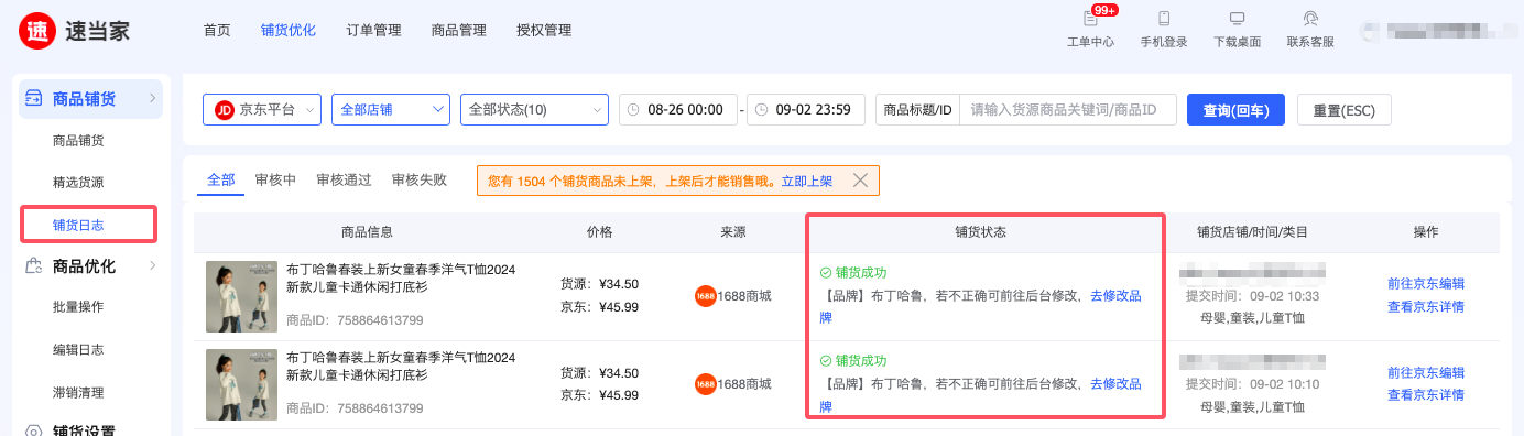 在【铺货日志】中查看铺货结果,包裹铺货失败、铺货成功