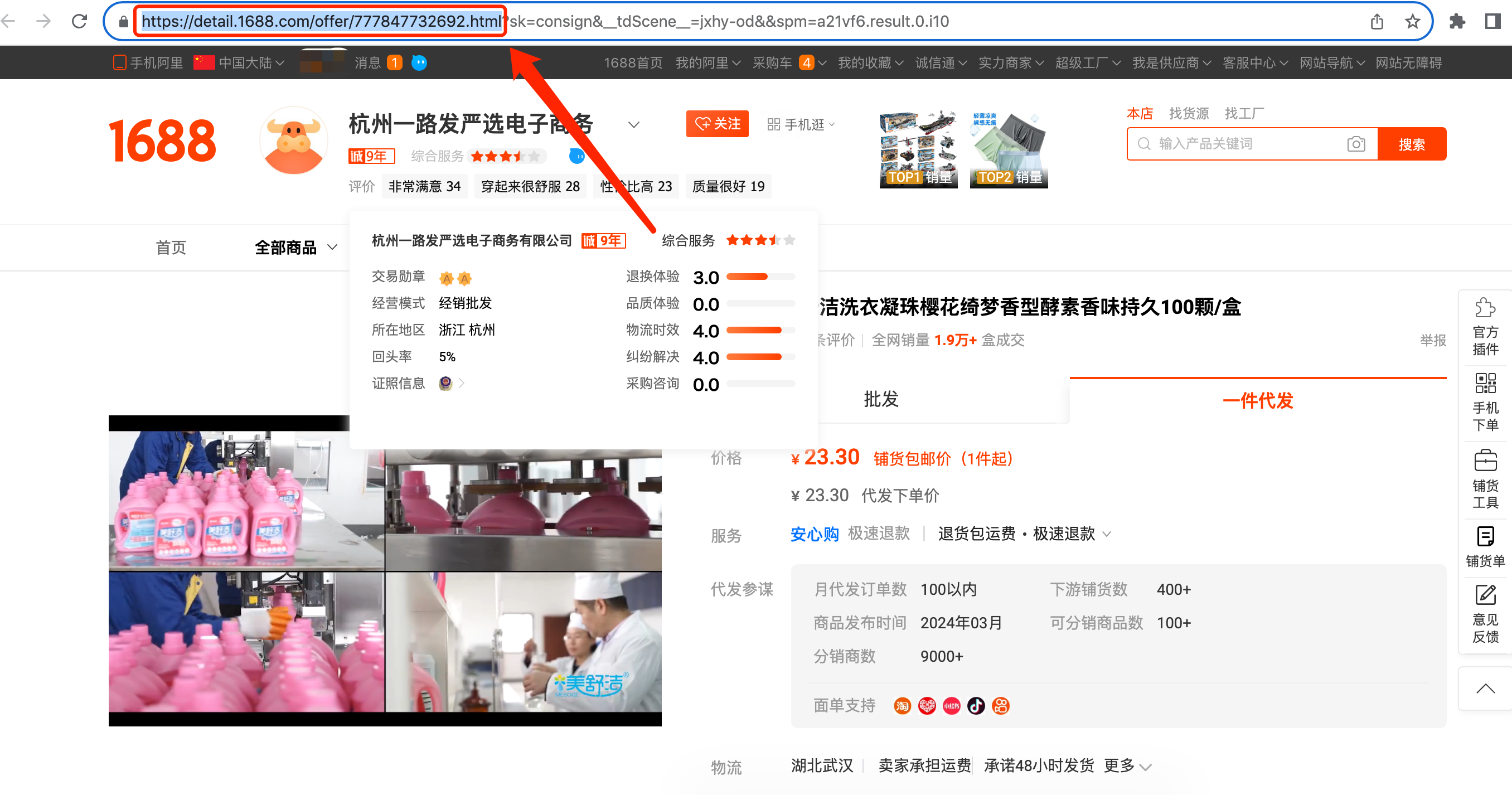 - 电脑端:登录1688,找到支持一件代发商品,从浏览器 地址栏复制商品链接,货源链接样例:https://detail.1688.com/offer/671910290035.html,不要复制错了哦~