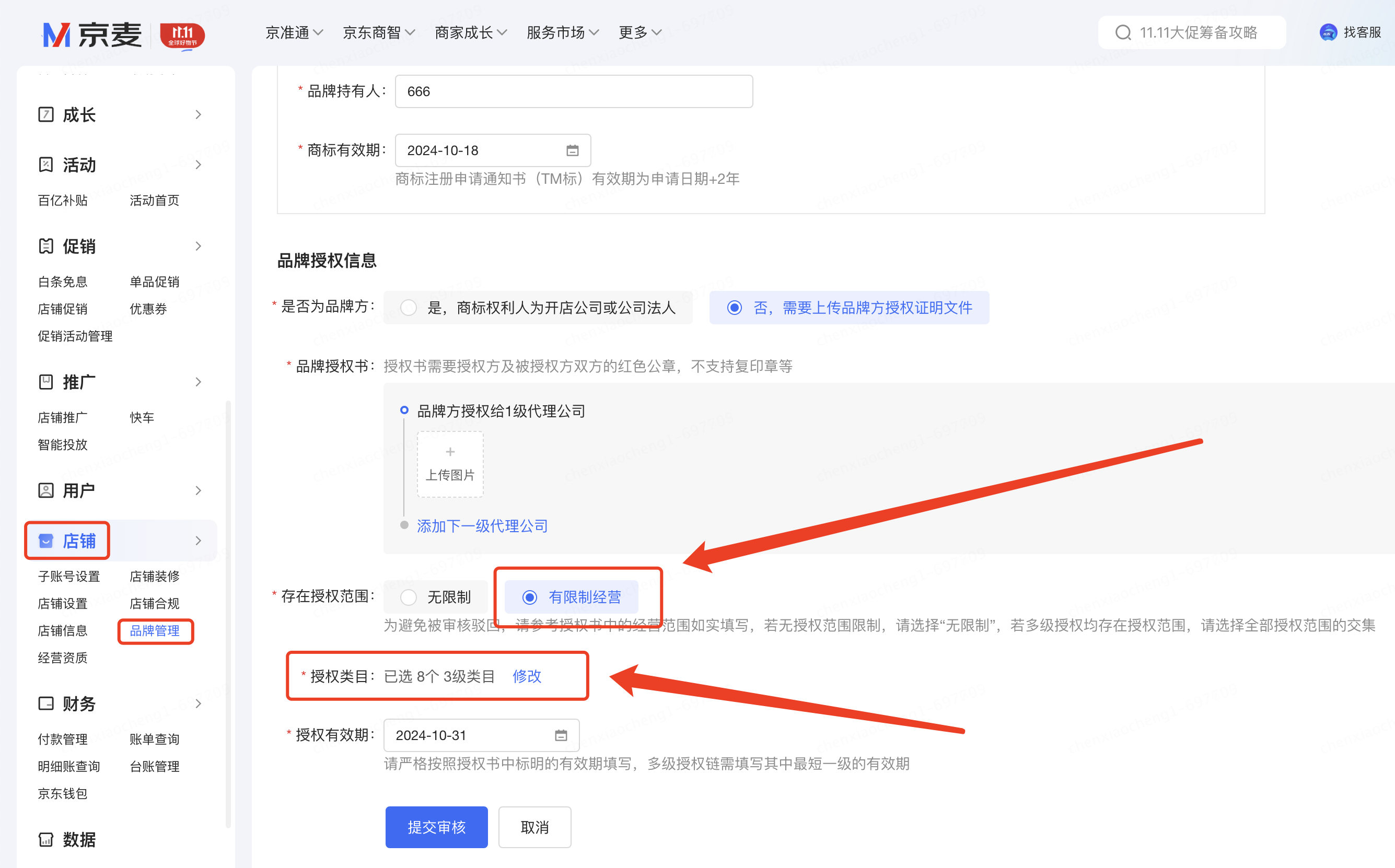 - 有限制经营:如品牌方或者上一级授权方给下级授权时只授权了部分范围,选此选项,并且需要补充授权的类目范围;