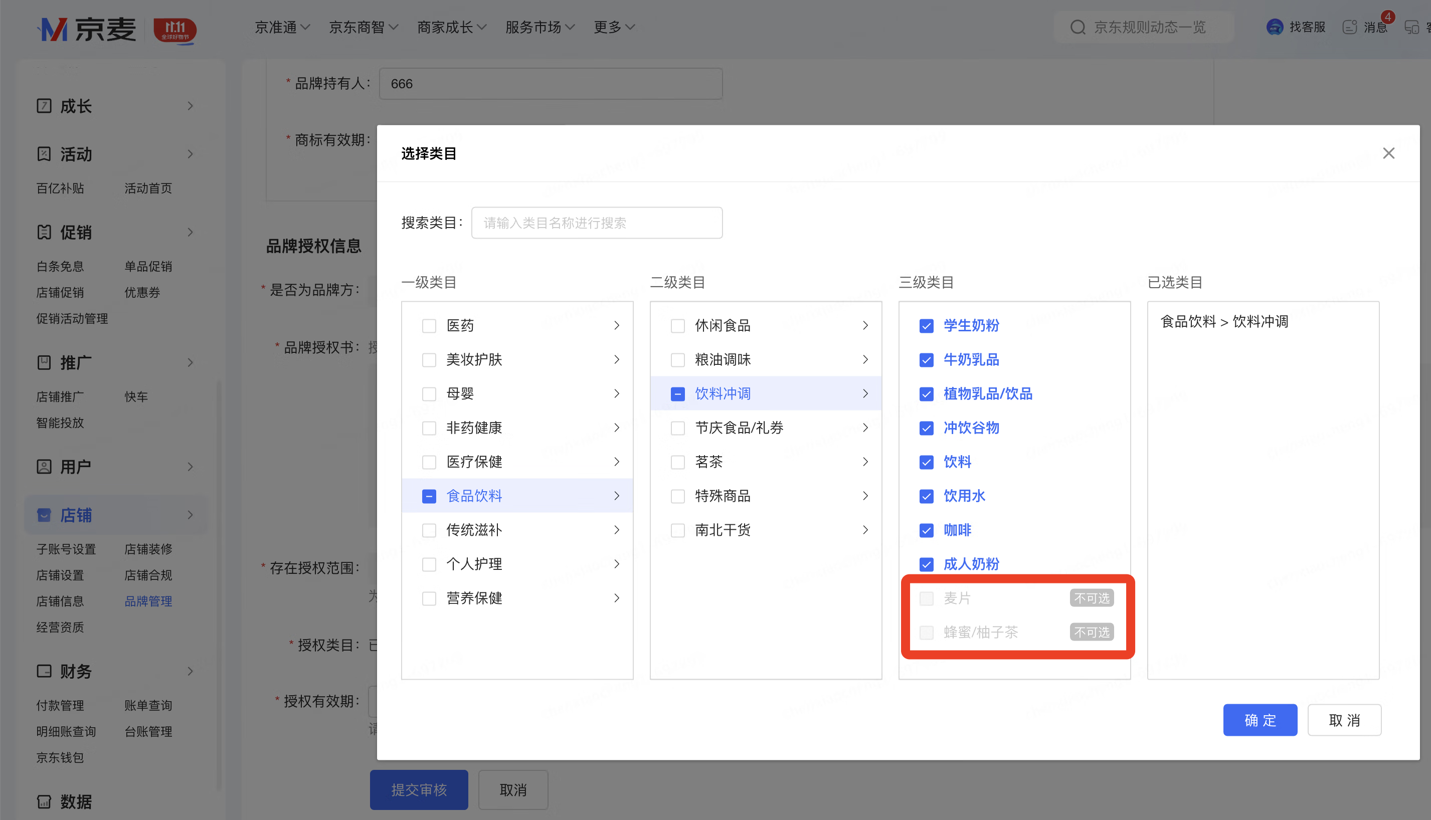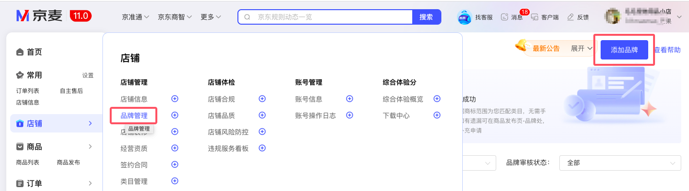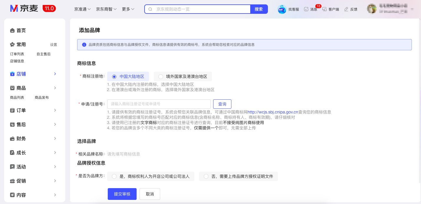 路径:京麦商家后台—店铺—店铺管理—品牌管理-添加品牌