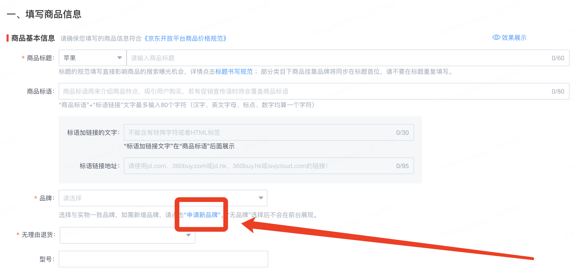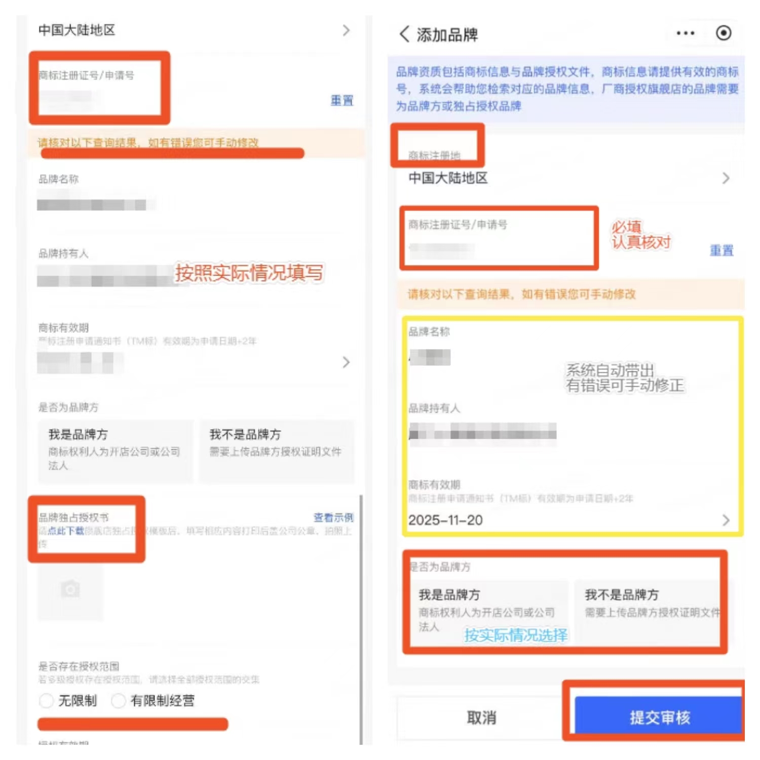 - 品牌名称:品牌名称=商标名,请以商标局数据为准,请勿修改或者添加英文名,避免与官方数据校对失败导致驳回;