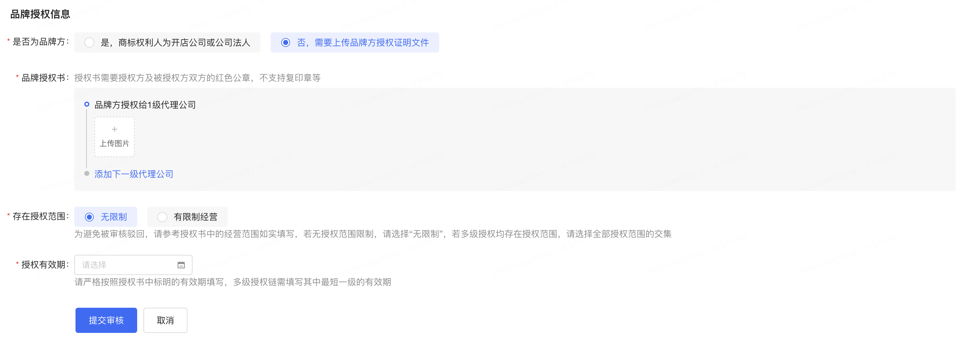 2. 品牌授权书:逐级添加授权书文件;