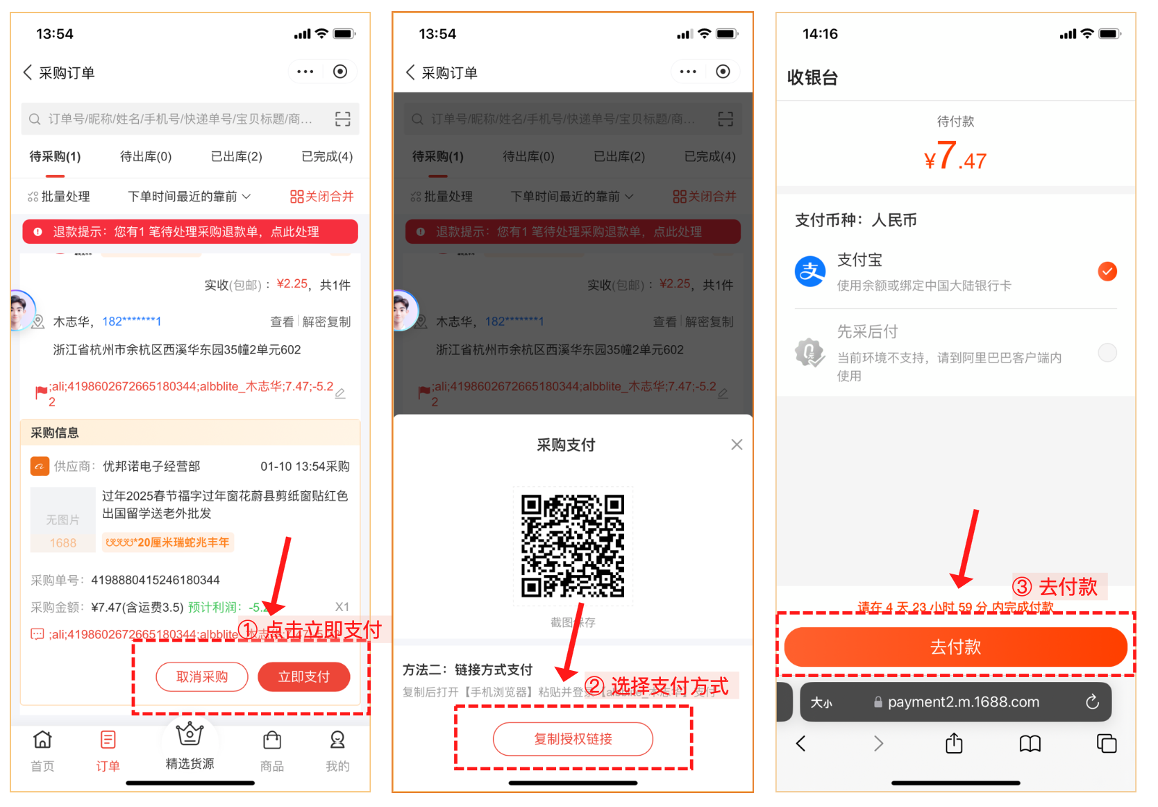 采购后,点击【立即支付】,选择支付方式,按照页面提示操作,向供应商付款