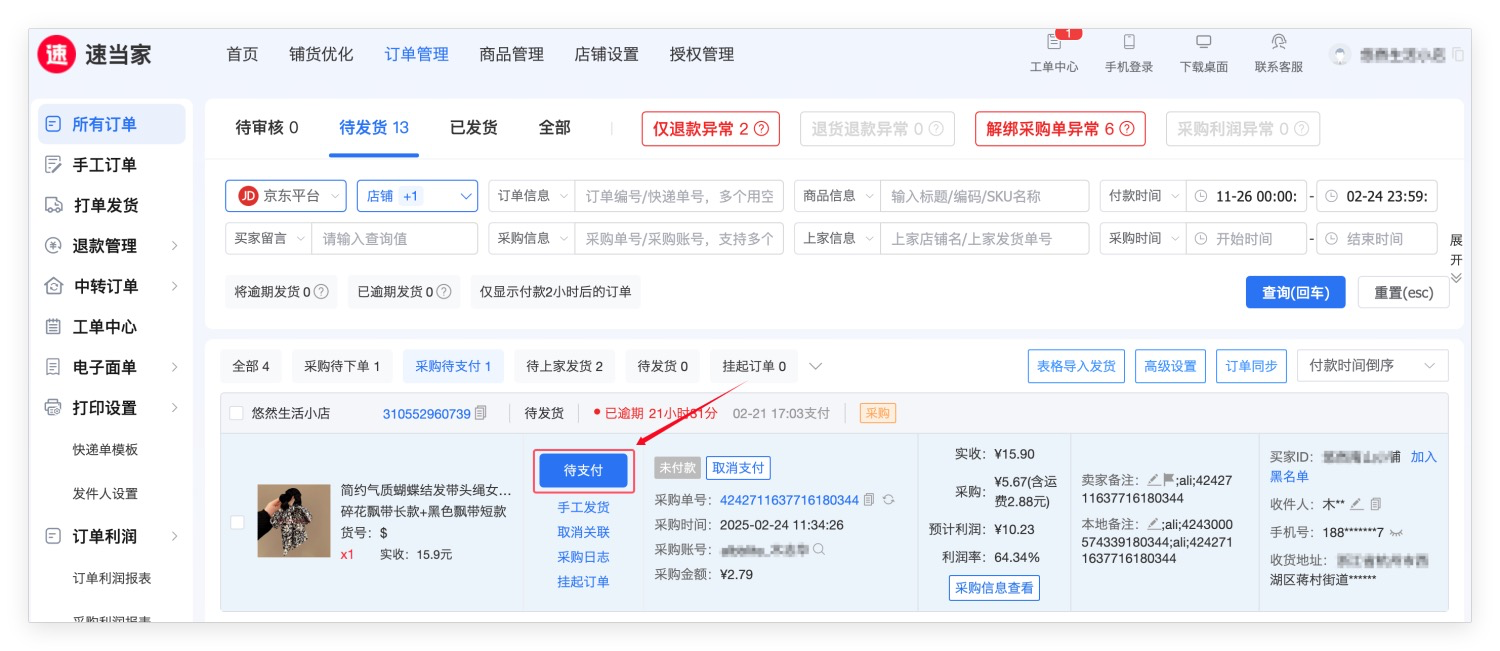 下单成功后,点击【待支付】支付货款