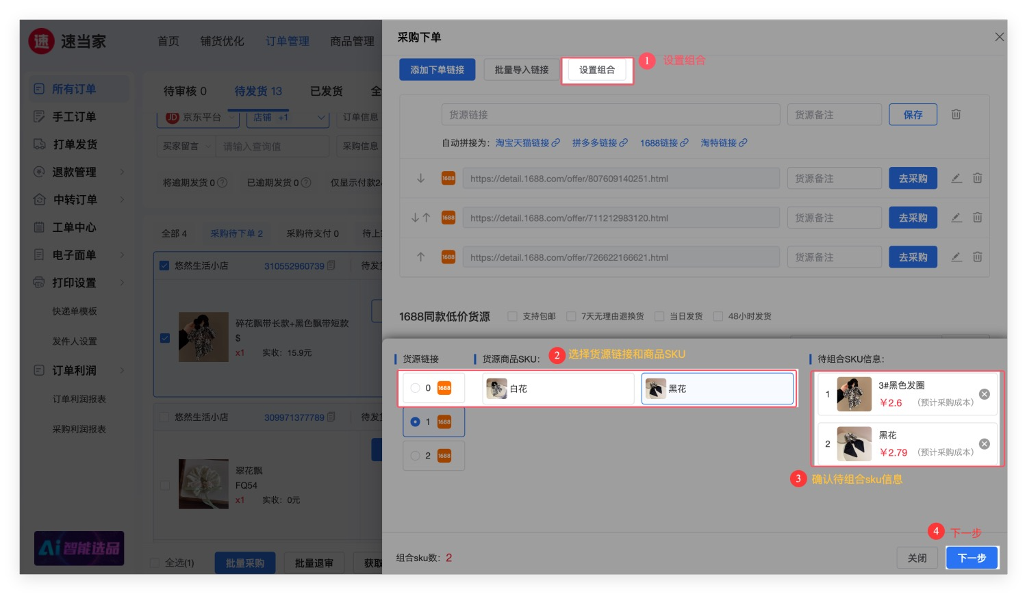 组合商品采购下单 适用于同平台不同SKU 组合关联,仅需关联一次,自动记忆,一键采购下单,供应商发货后,系统自动发货