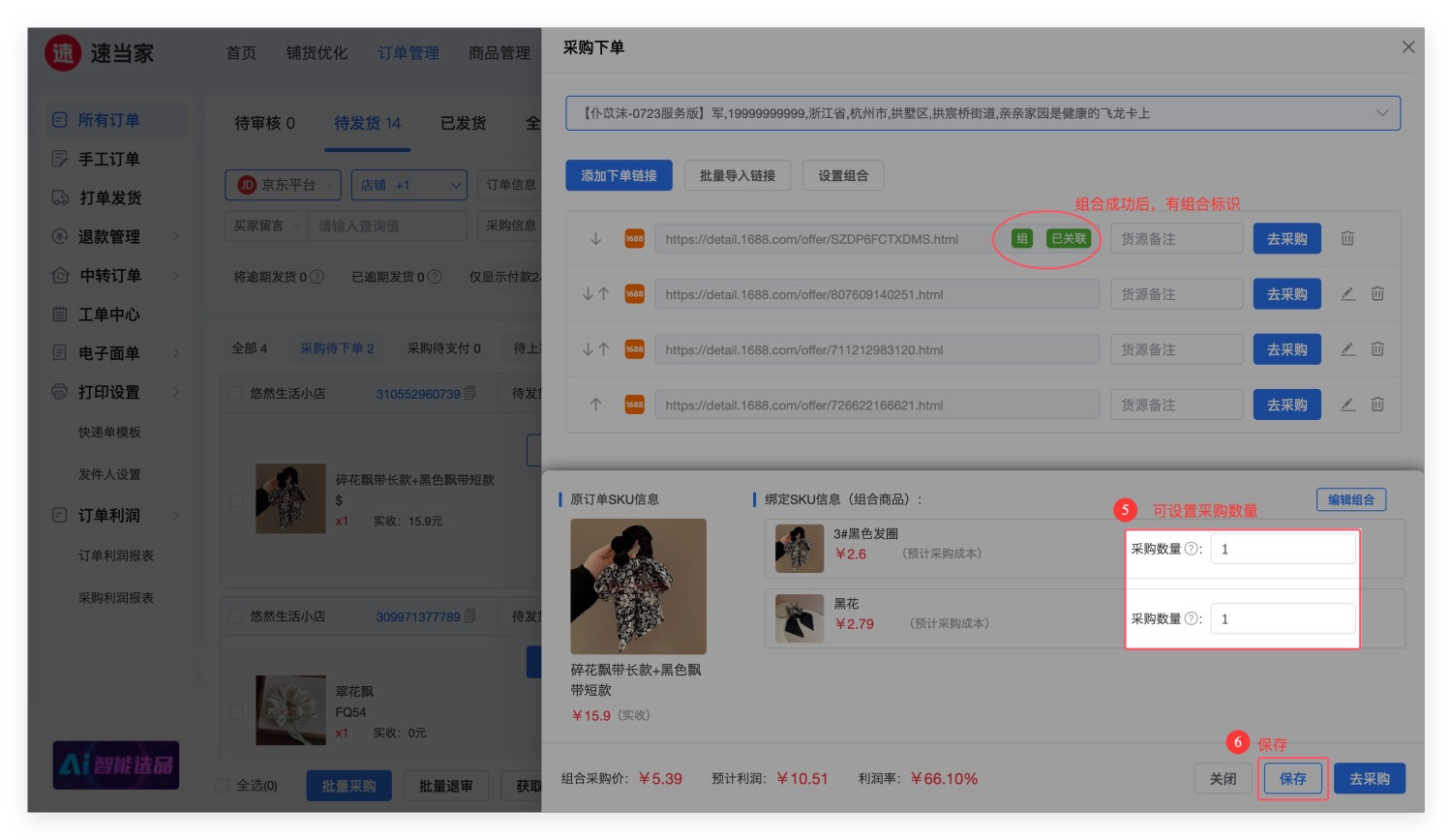 • 支持设置绑定货源SKU的采购数量,点击【保存后】,货源链接会有【组合】标识。