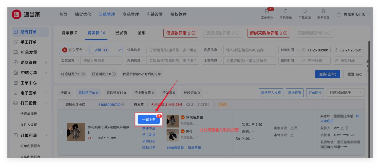 关联成功后,后续订单自动关联组合的货源,一键即可下单。