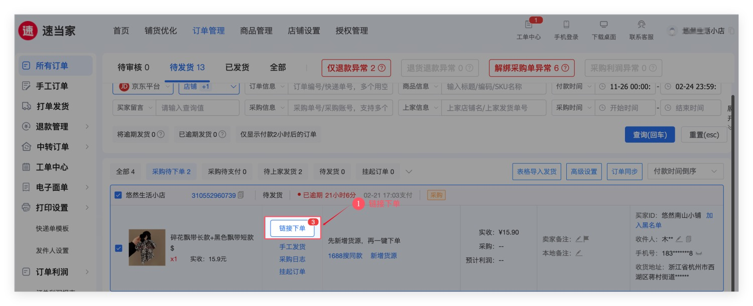 操作路径:在【订单管理】-【待发货】页面,点击【链接下单】