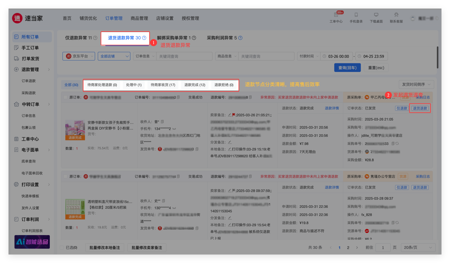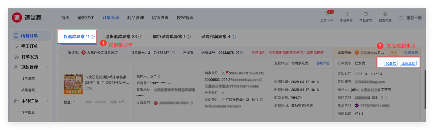 ② 退货退款异常:发货后买家申退货退款,商家未向上家申请退款或者上家拒绝退款的情况,建议商家在【退货退款异常】页面,及时向上家申请退货退款,上游退款节点清晰,帮商家及时掌握退款情况。