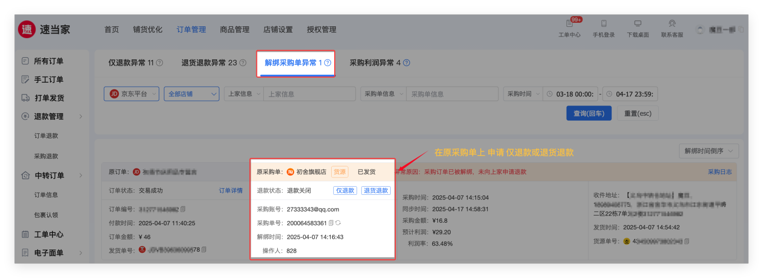 ③解绑采购单异常:买家申请仅退款、退货退款,商家采购单已解绑未向上家申请退款或退货退款的订单。点击进入解绑采购单异常页面,在原采购单 上申请售后。