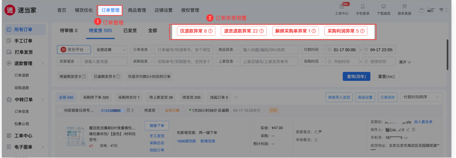 异常订单预警:是针对有可能产生亏损风险的订单,系统进行高亮显示,提醒商家尽快处理订单,减少亏损!