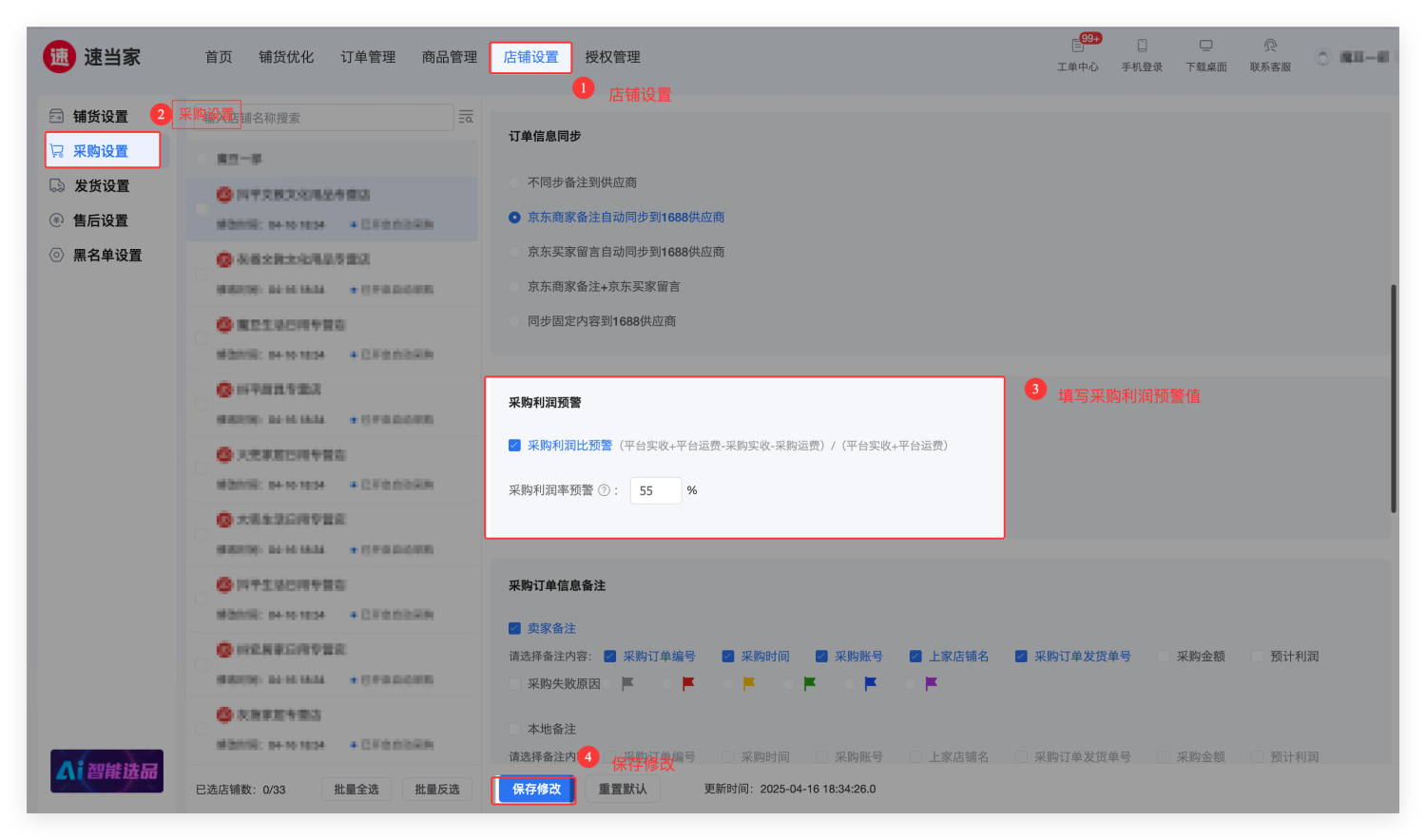 商家自行设置【采购利润率预警值】,当订单采购率低于预警值,订单将会在采购利润异常页面展示。商家可根据订单情况处理订单。