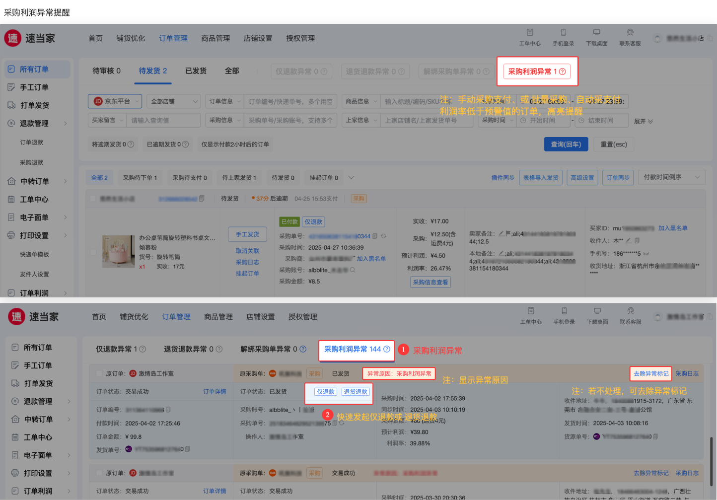 - 批量 / 自动采购:订单量较多的商家,建议批量采购或开启自动采购。支付完成后,系统持续监控订单,当订单的利润率低于设置的预警值时,系统即刻高亮提醒商家。在【采购利润异常】页面,商家可快速发起仅退款,已发货订单,快速发起退货退款!