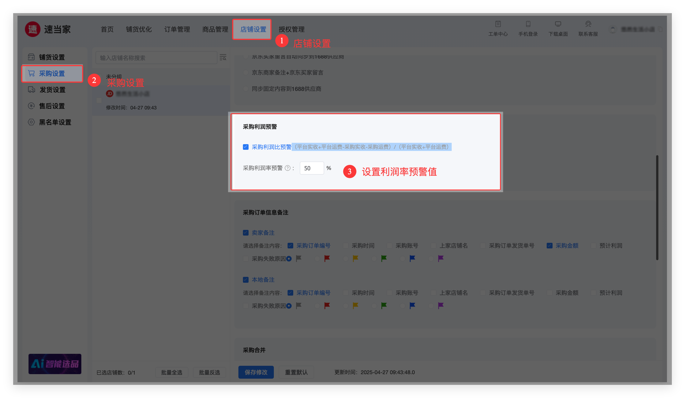 速当家【利润预警】功能,需要商家提前在系统内设置利润预警值,当订单采购利润率低于所设置的预警值时,订单自动高亮提醒,确保风险早发现。