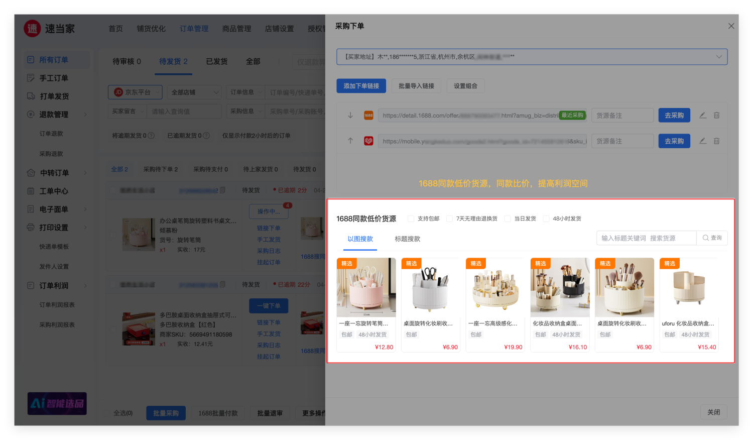 1.快速更换供应商:速当家依托 1688 海量货源,提供1688搜同款功能,同款货源展示价格、是否包邮,帮助商家快速筛选同款低价商品,一键替换供应商,减少亏损,提高利润空间。