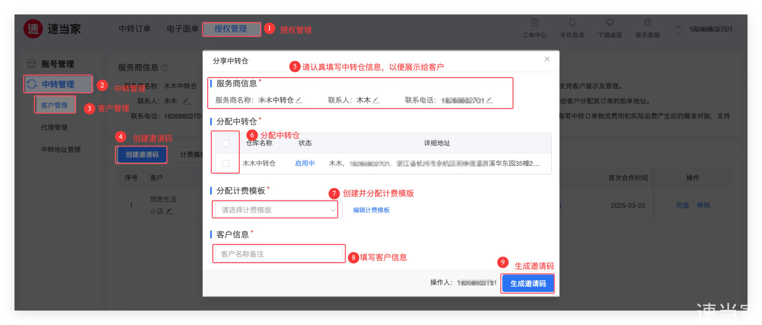 操作路径:授权管理->中转管理->客户管理->创建邀请码