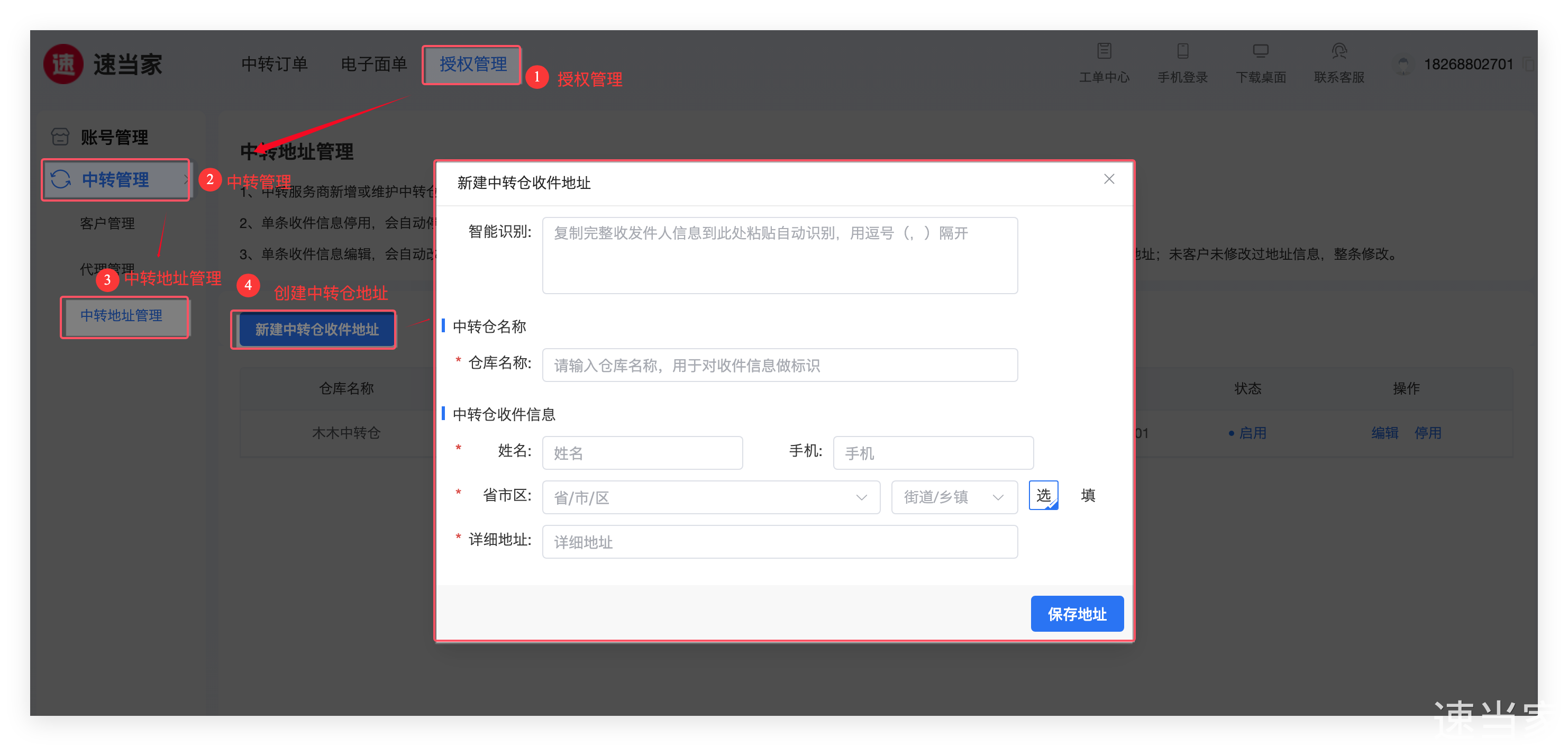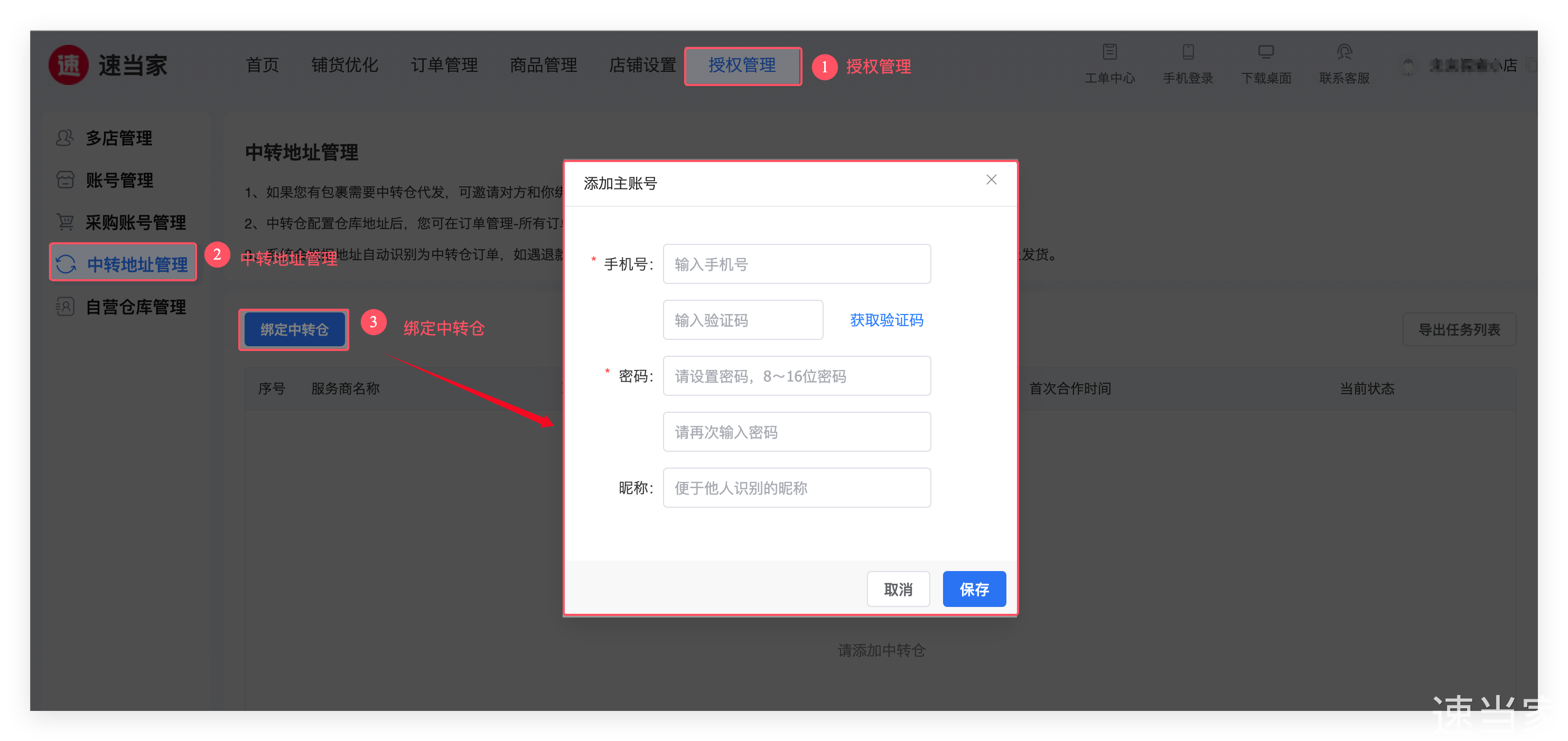 (2) 在速当家【授权管理】-【中转地址管理】页面,添加主账号后 绑定中转仓。