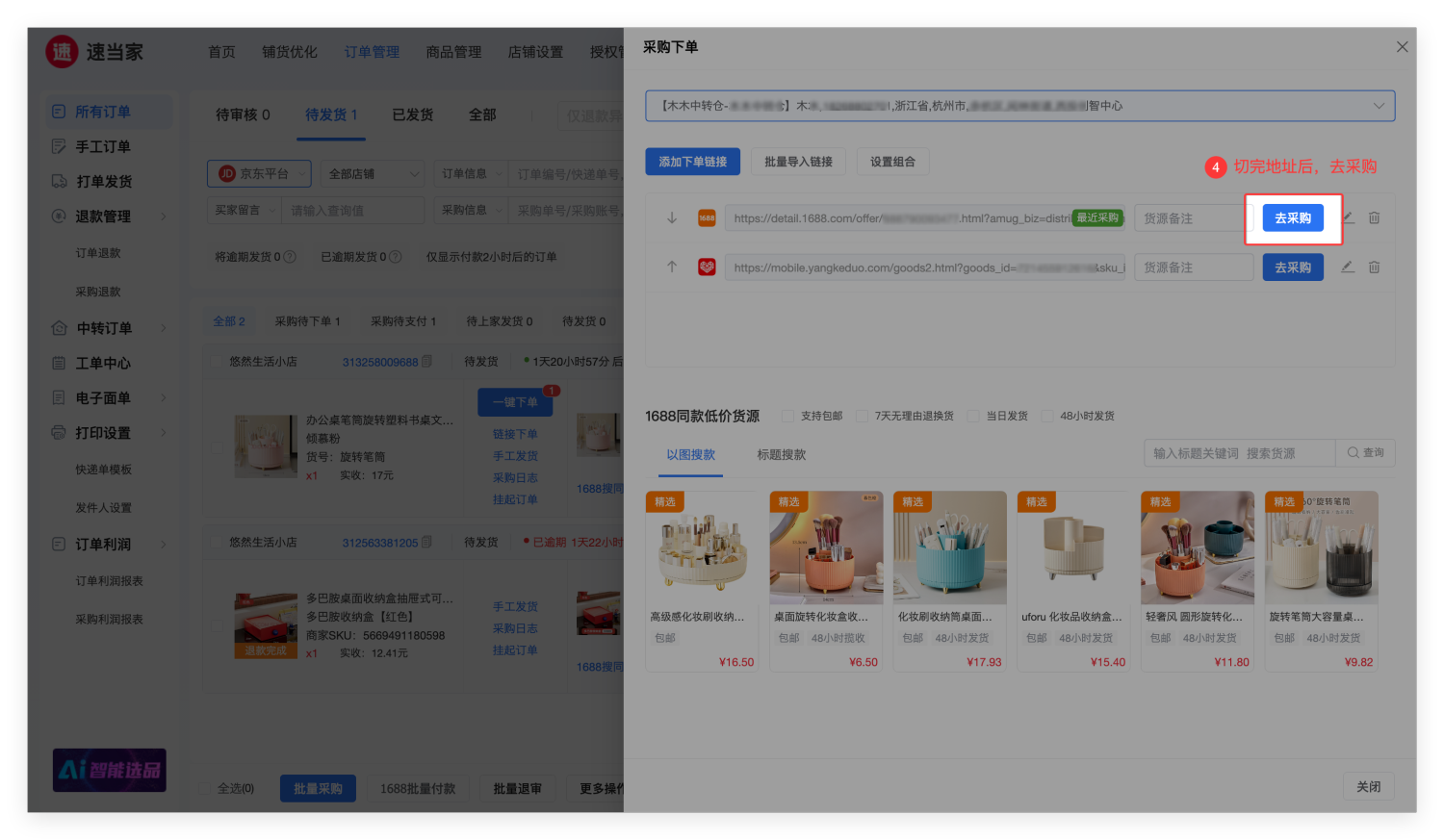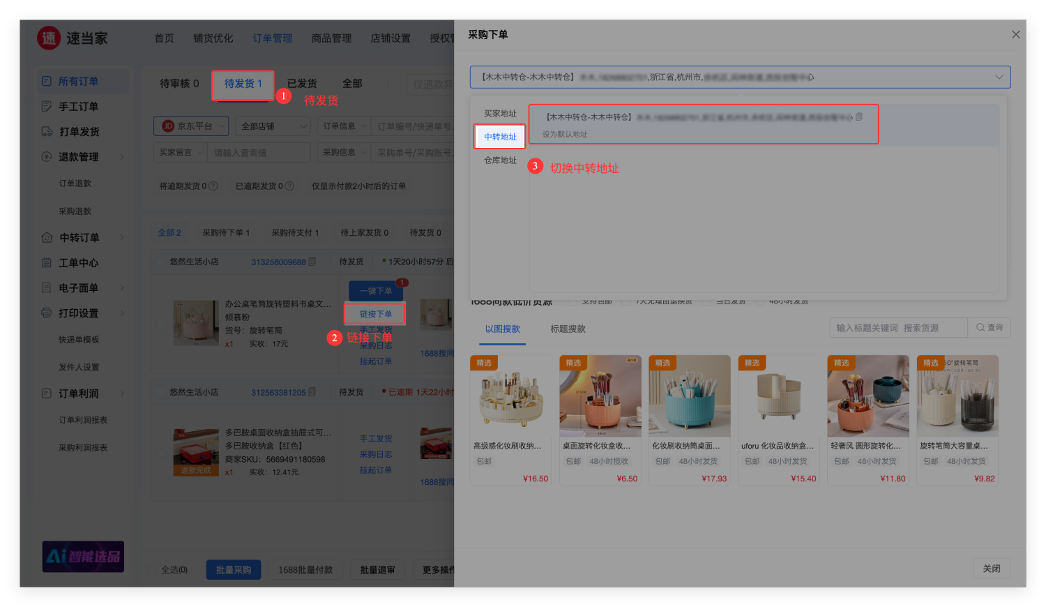 在【待发货】-【链接下单】-【采购下单】页面,切换地址为【中转仓或仓库】地址, 之后去采购下单。该笔订单将以中转仓地址采购下单。