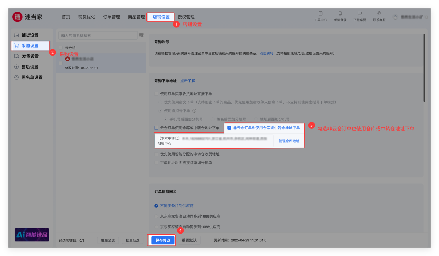 在【店铺设置】-【采购设置】页面中,选择使用仓库或中转仓地址下单