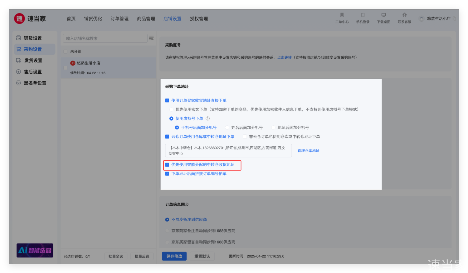 注:智能分配中转仓收货地址的优先级 高于 其他配置,系统将优先以智能分配的中转仓地址下单。