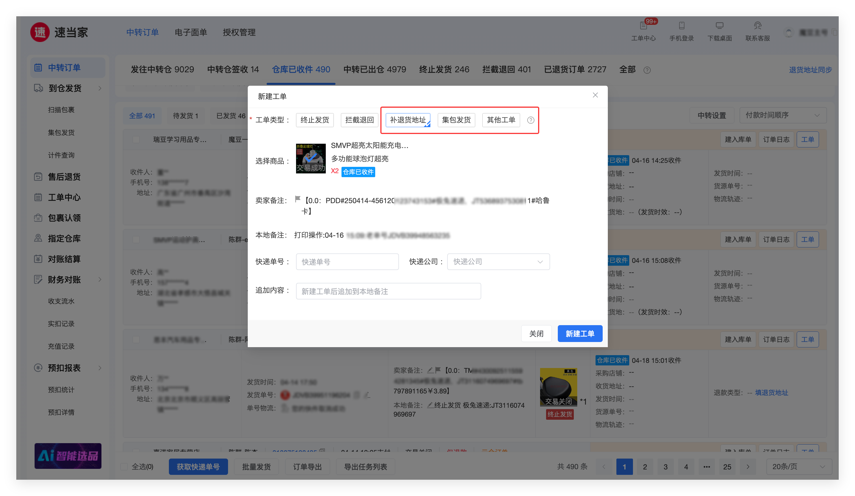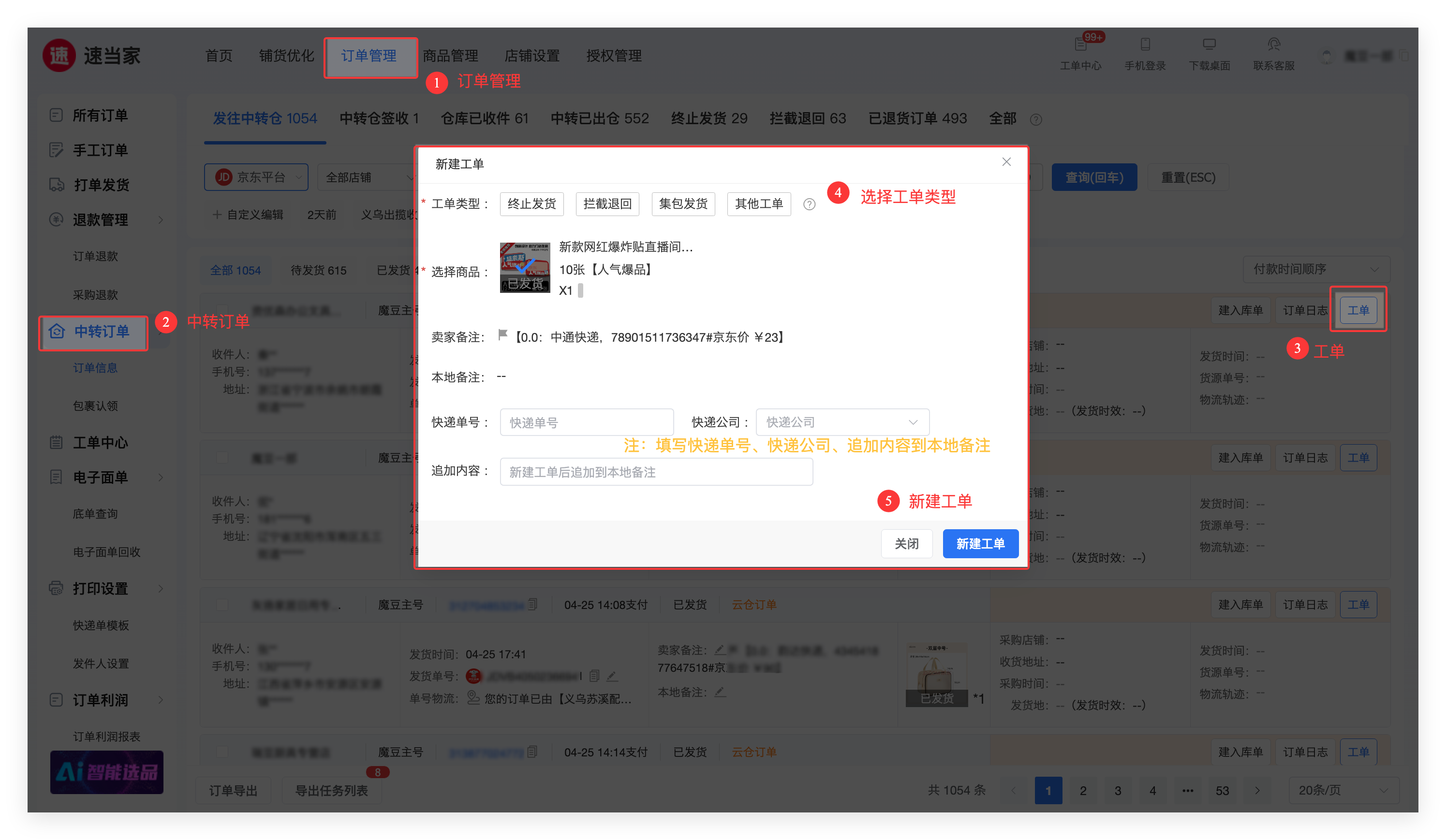 商家和中转仓(云仓)在【中转订单】选择相匹配的工单类型,填写快递单号、快递公司,工单内容(追加到本地备注),新建工单。