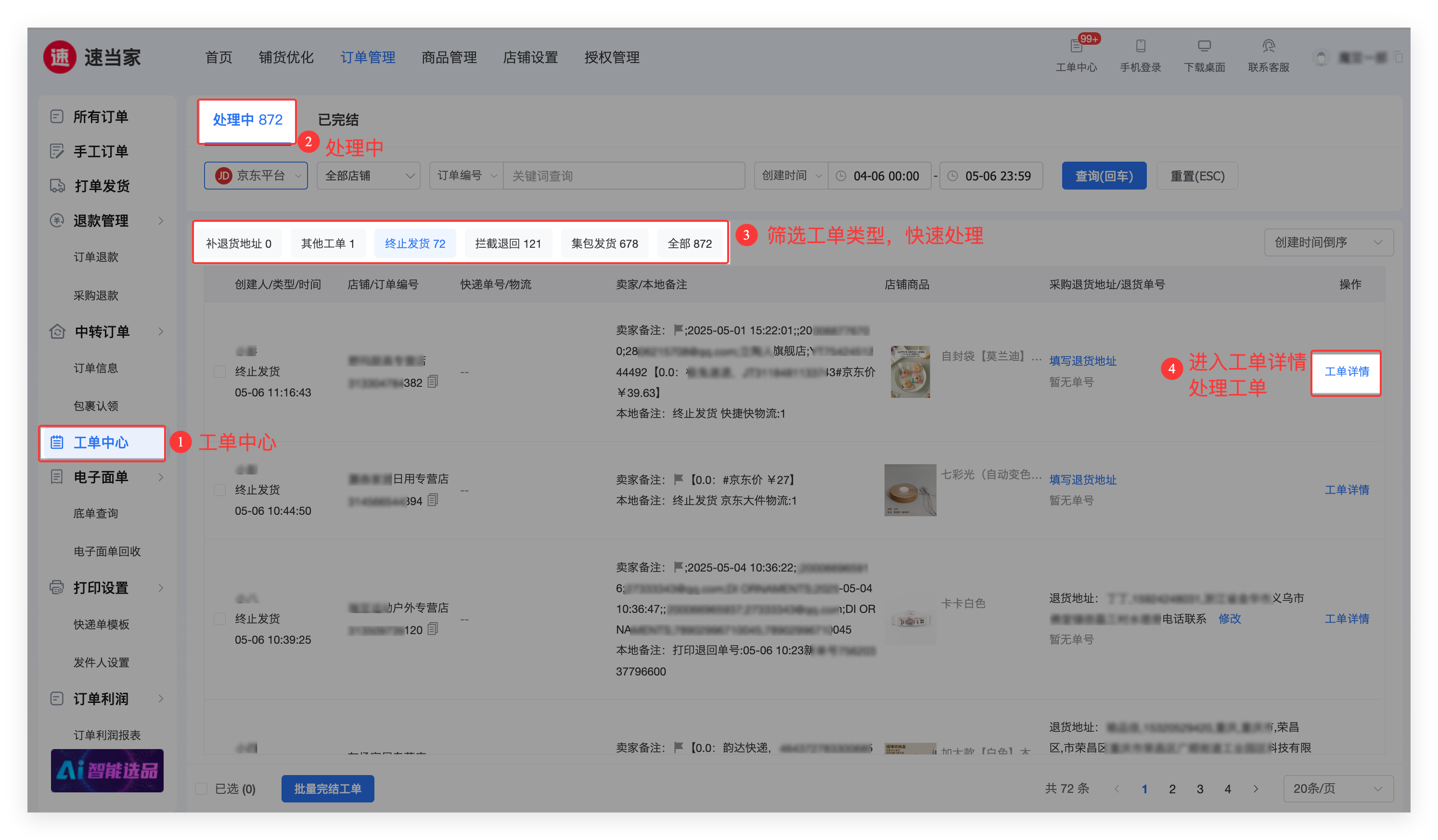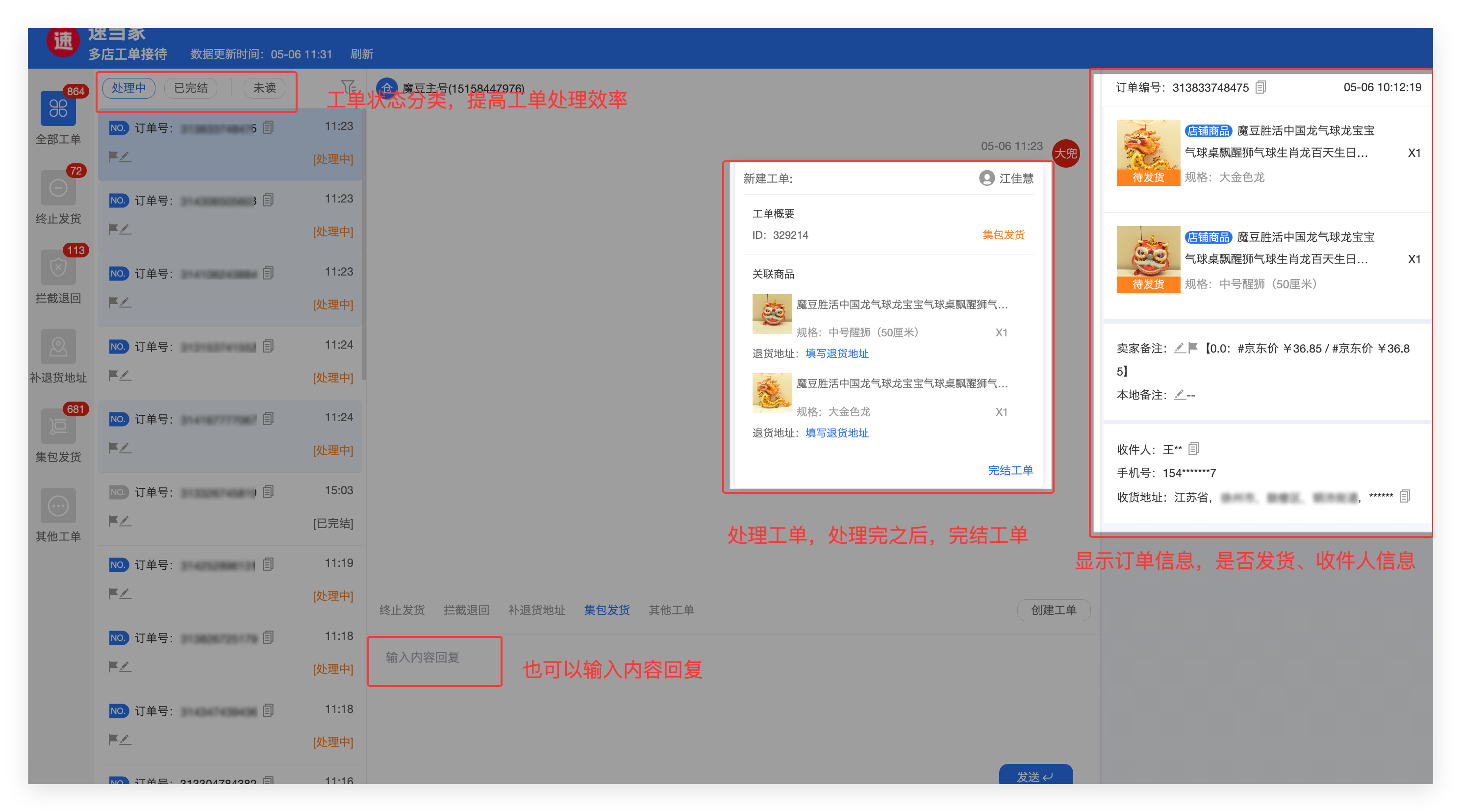 不能正常寄出的包裹,都可通过工单中心处理,线上工单协同处理,处理流程清晰,新人也很容易上手;