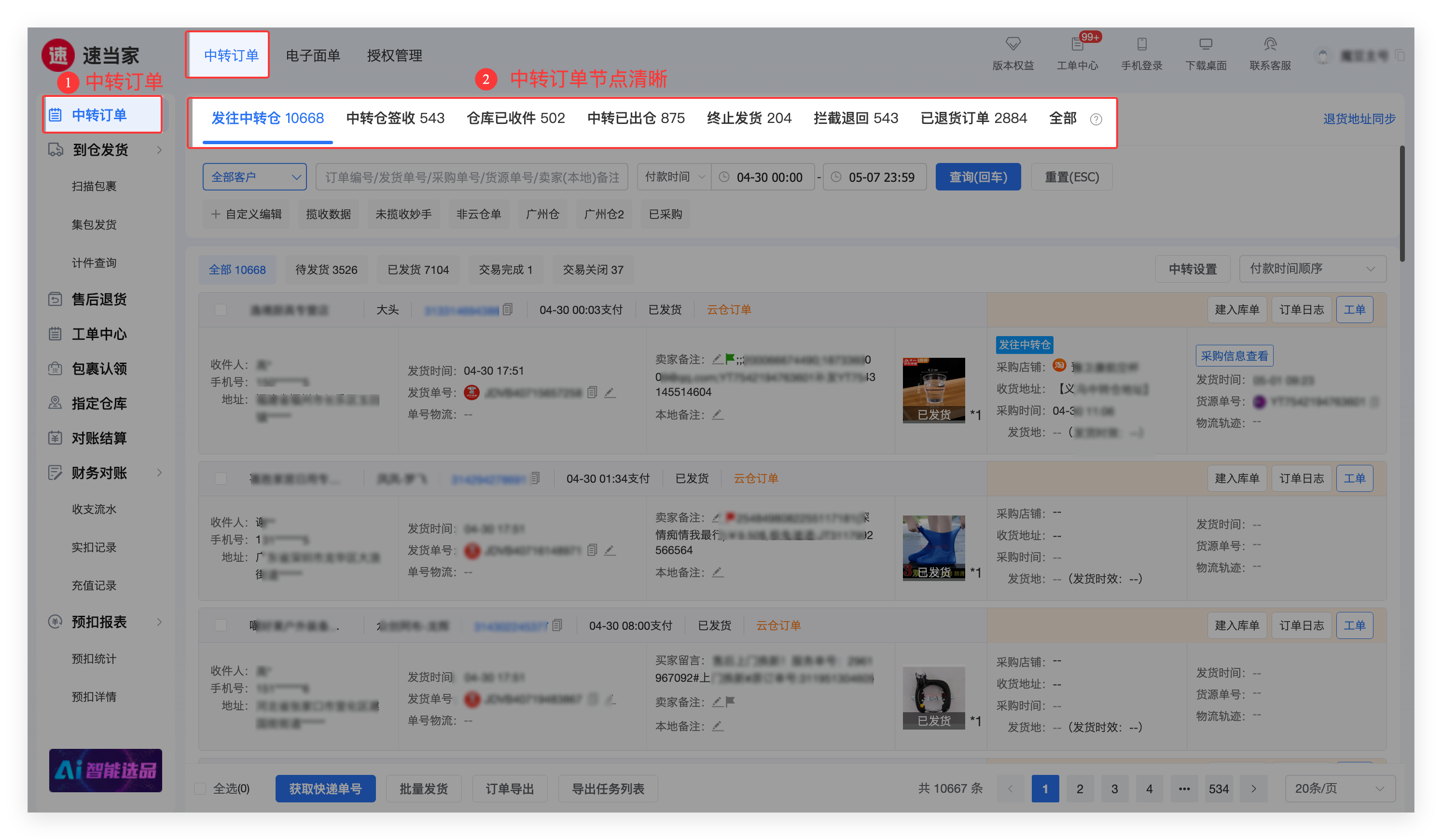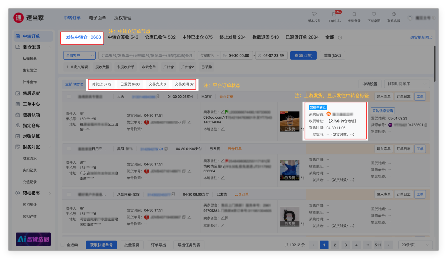 商家在速当家用中转仓地址下单,采购下单后, 中转仓即可在速当家【中转订单】页面跟进订单,帮助中转仓实时掌握订单节点,跟进物流状态。