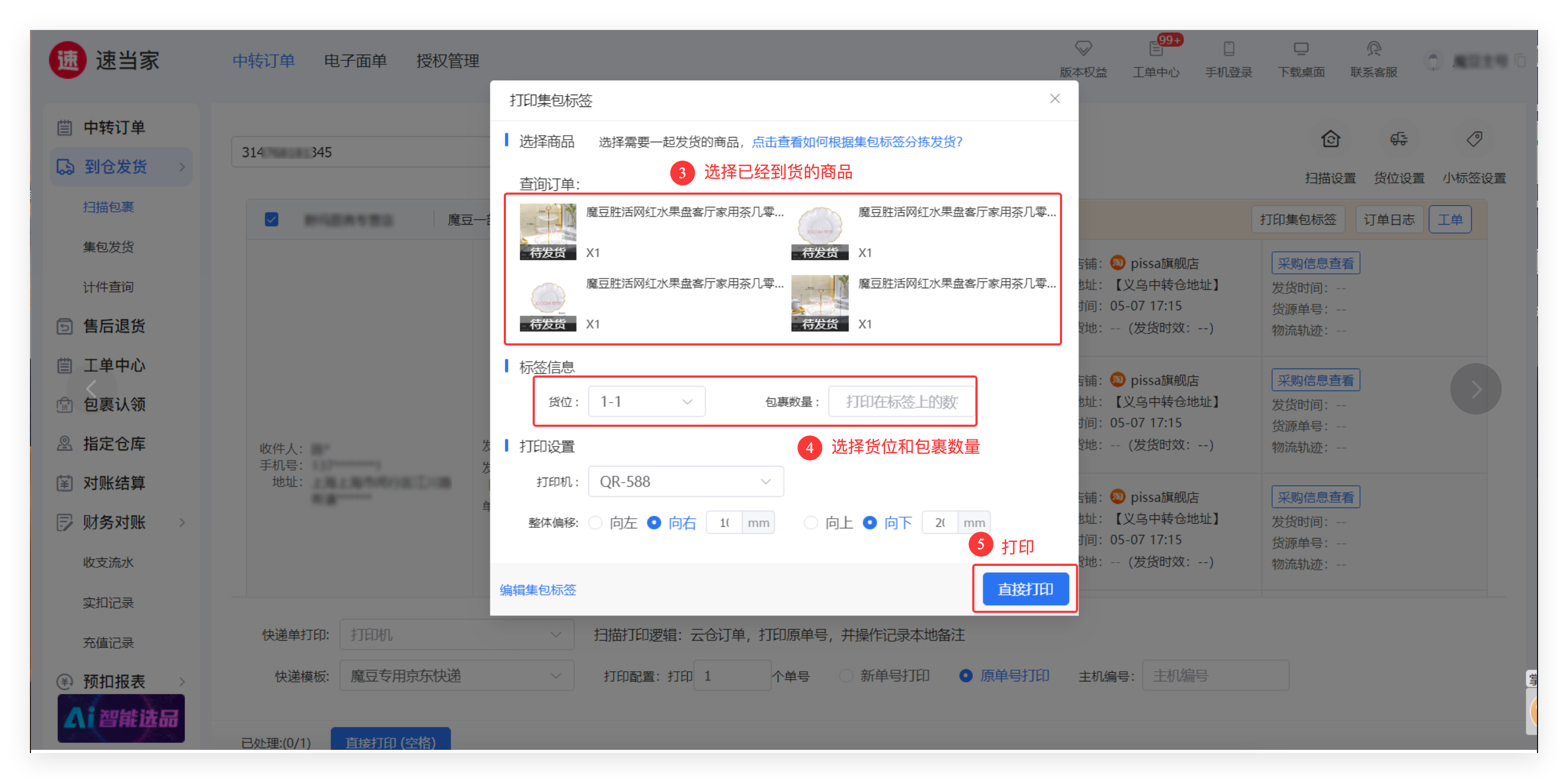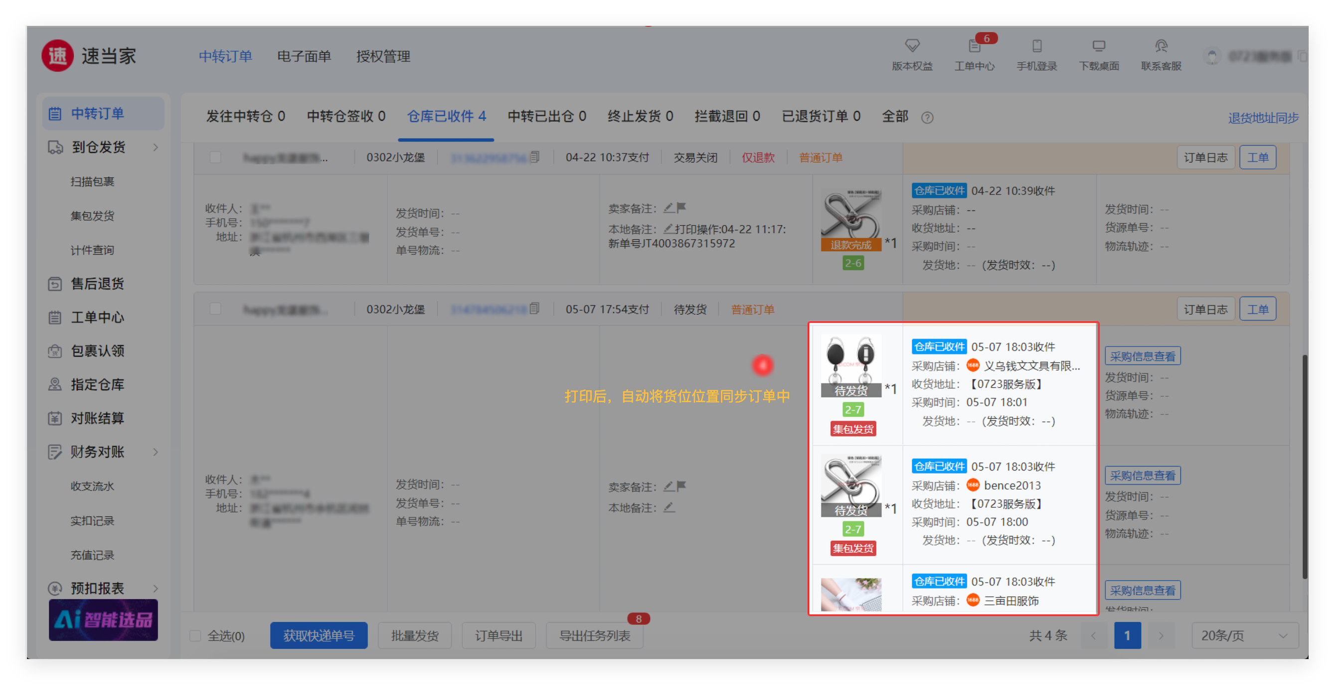 - ③ 打印完成后,系统自动将货位信息同步到订单中,