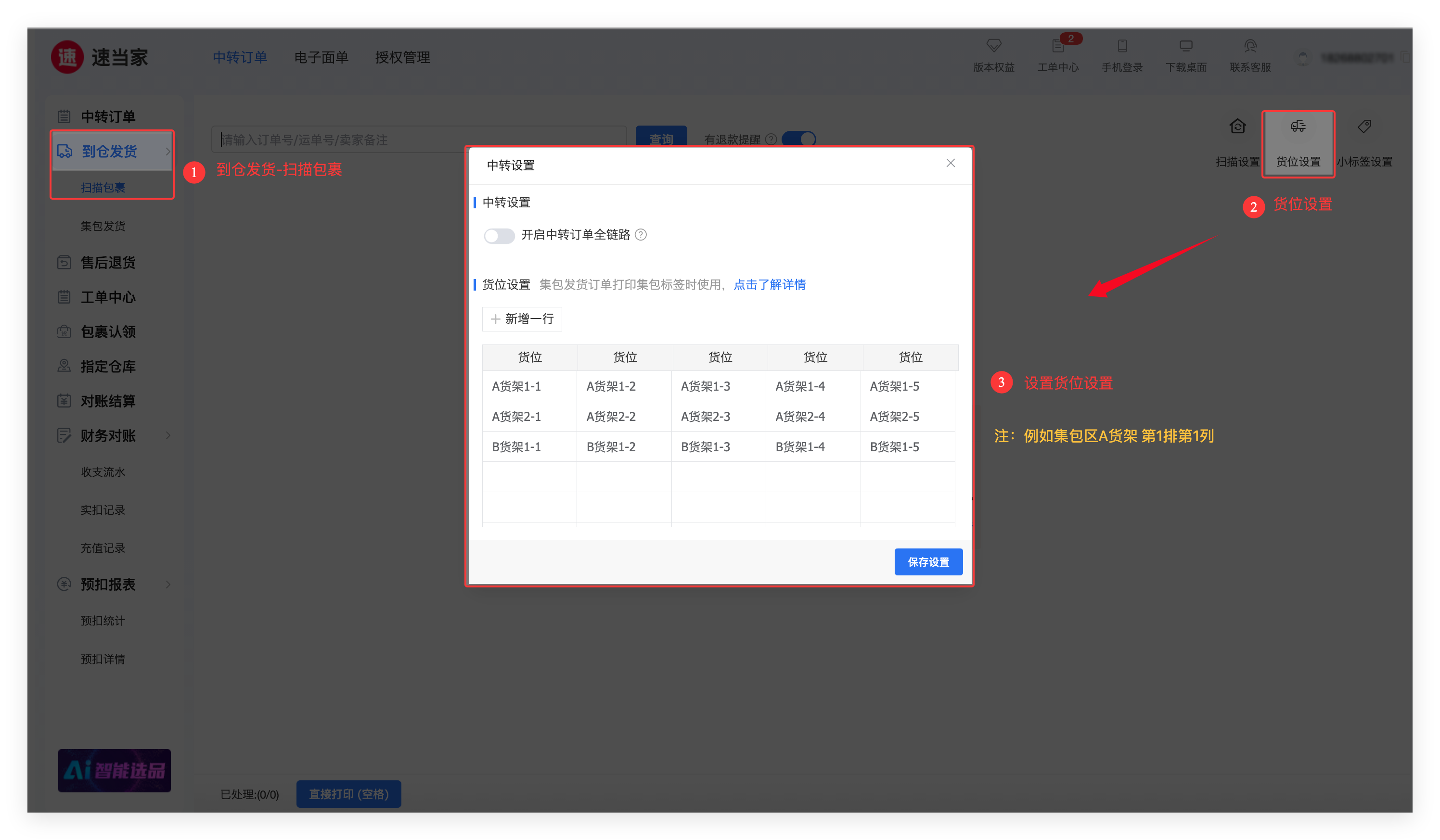 1. 在【到仓发货】->【扫描包裹】→【货位设置】中设置集包货位(例如:A货架1-1)