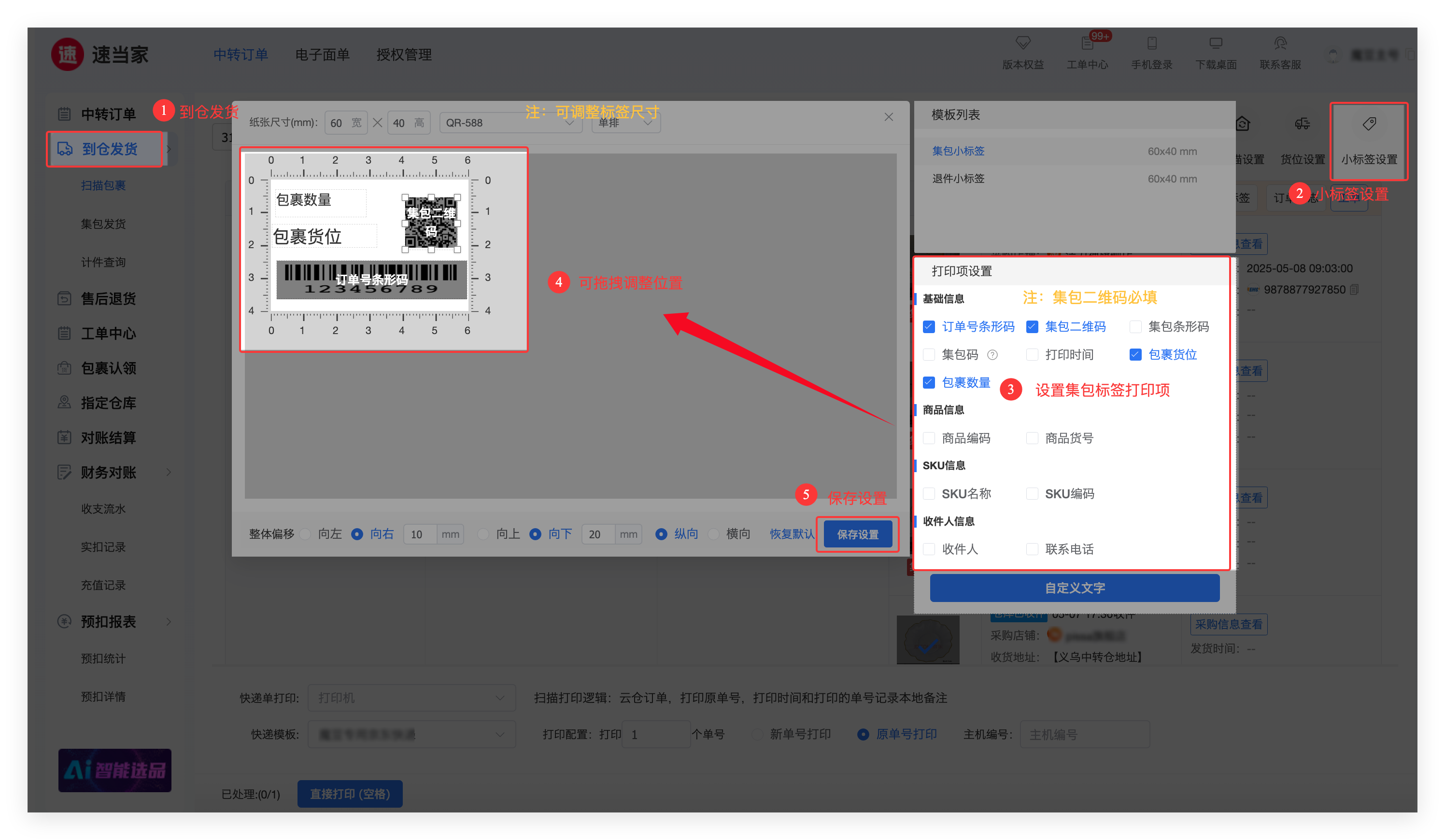 ② 点击【打印集包标签】,选择包裹存放货位和包裹数量。
