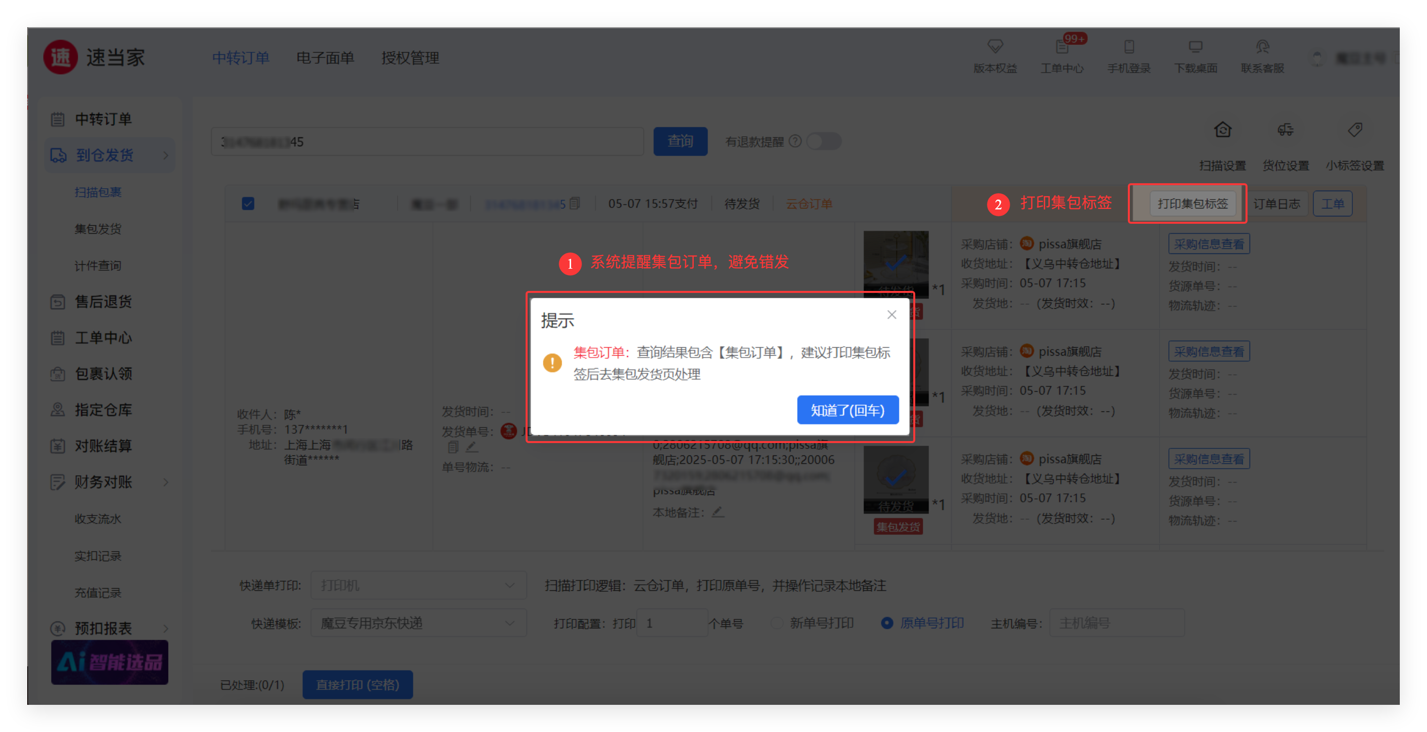① 扫描包裹运单号,系统识别为集包订单 语音+弹窗提示。