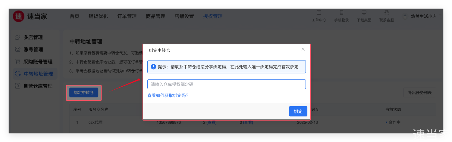 (2) 在速当家【授权管理】-【中转地址管理】页面,添加主账号后,输入绑定码即可 绑定中转仓。
