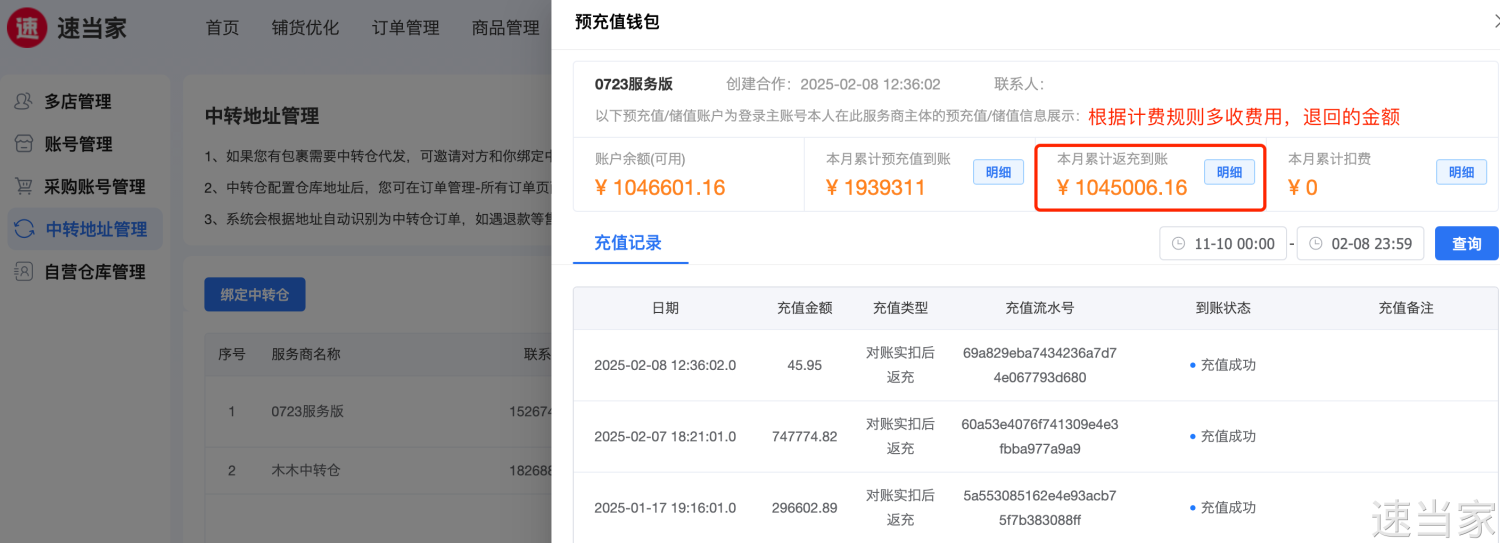 充值后,中转仓及客户 双方都能实时查看预充值钱包余额。