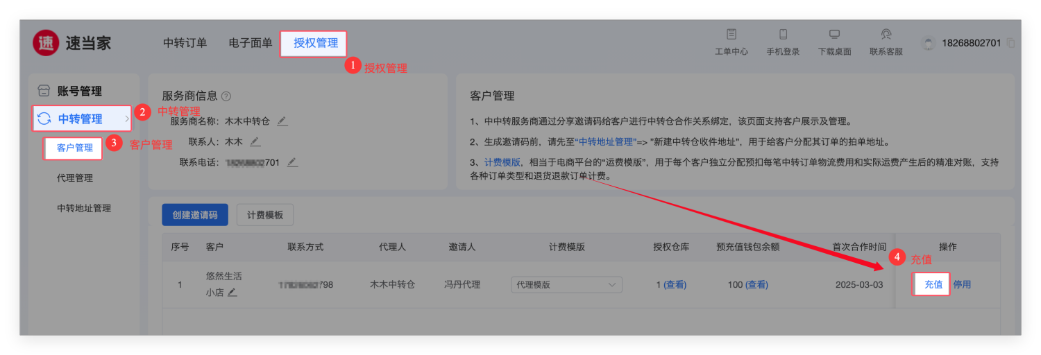 当代理商绑定好客户之后,中转仓在【客户管理】页面可查看代理商发展的所有客户并给客户充值。