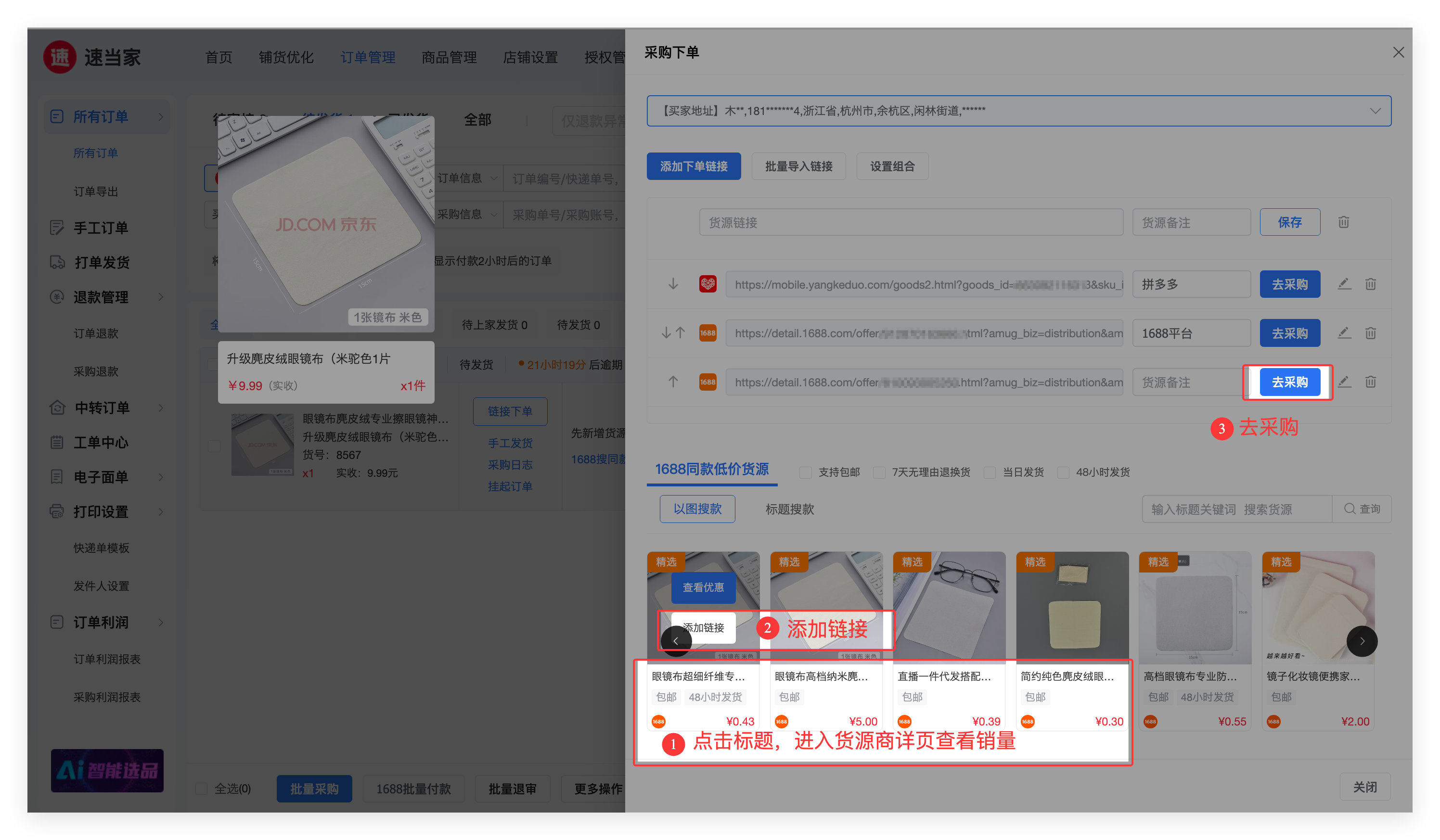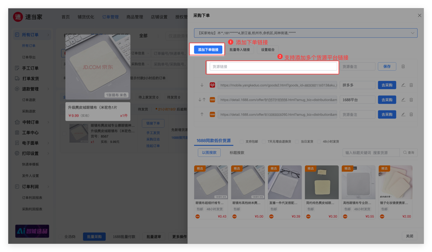 对此速当家新版提供两种解决方案,帮您找到同款低价货源。一键添加下单链接即可快速采购,大大提升补货效率与利润空间!