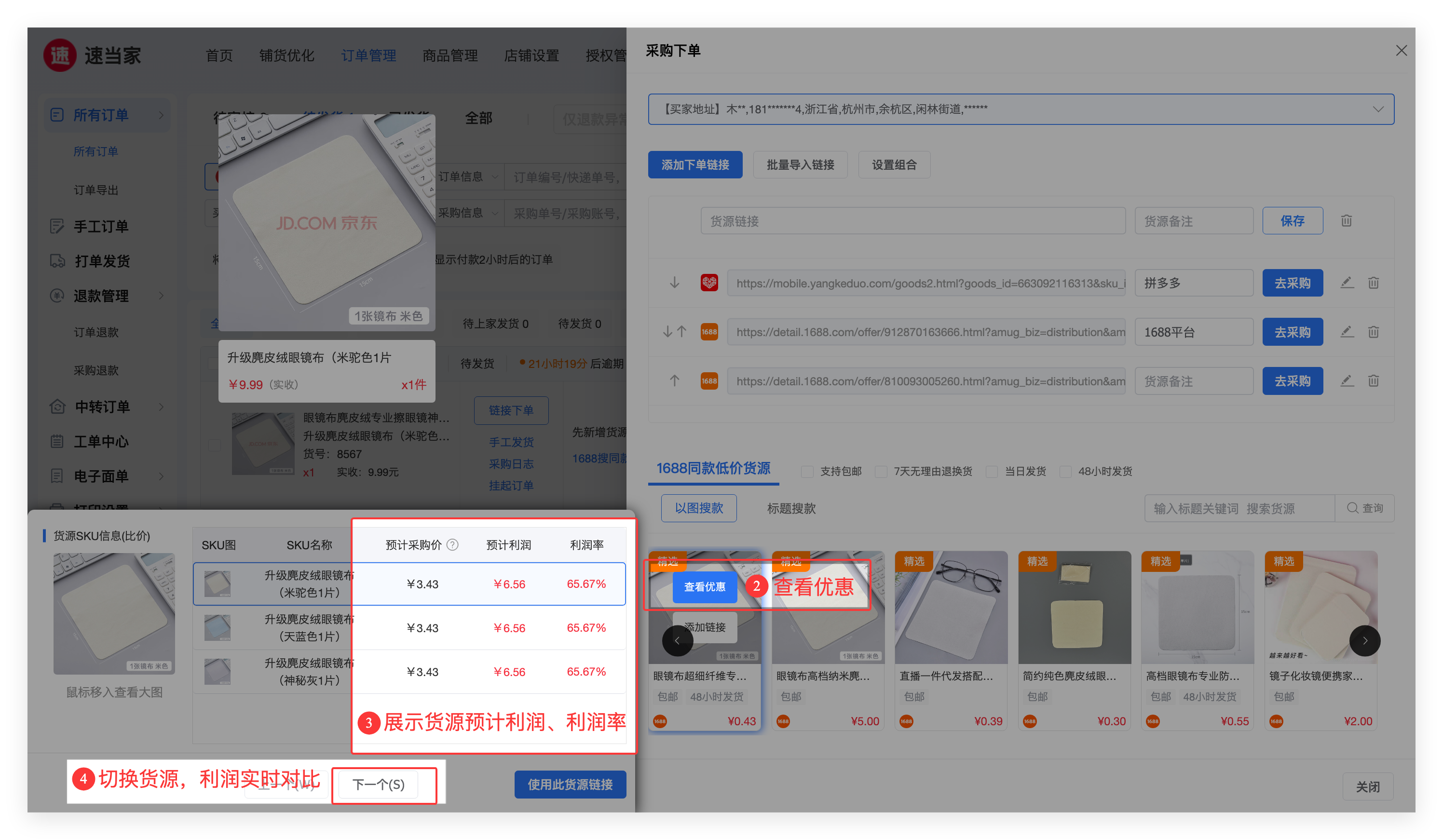 搜款比价,利润预判:系统基于订单SKU商品,自动推荐同款低价货源,同步展示预计采购价、预计利润及利润率。支持一键切换货源,实时对比利润,帮助商家迅速锁定利润最高的低价货源。